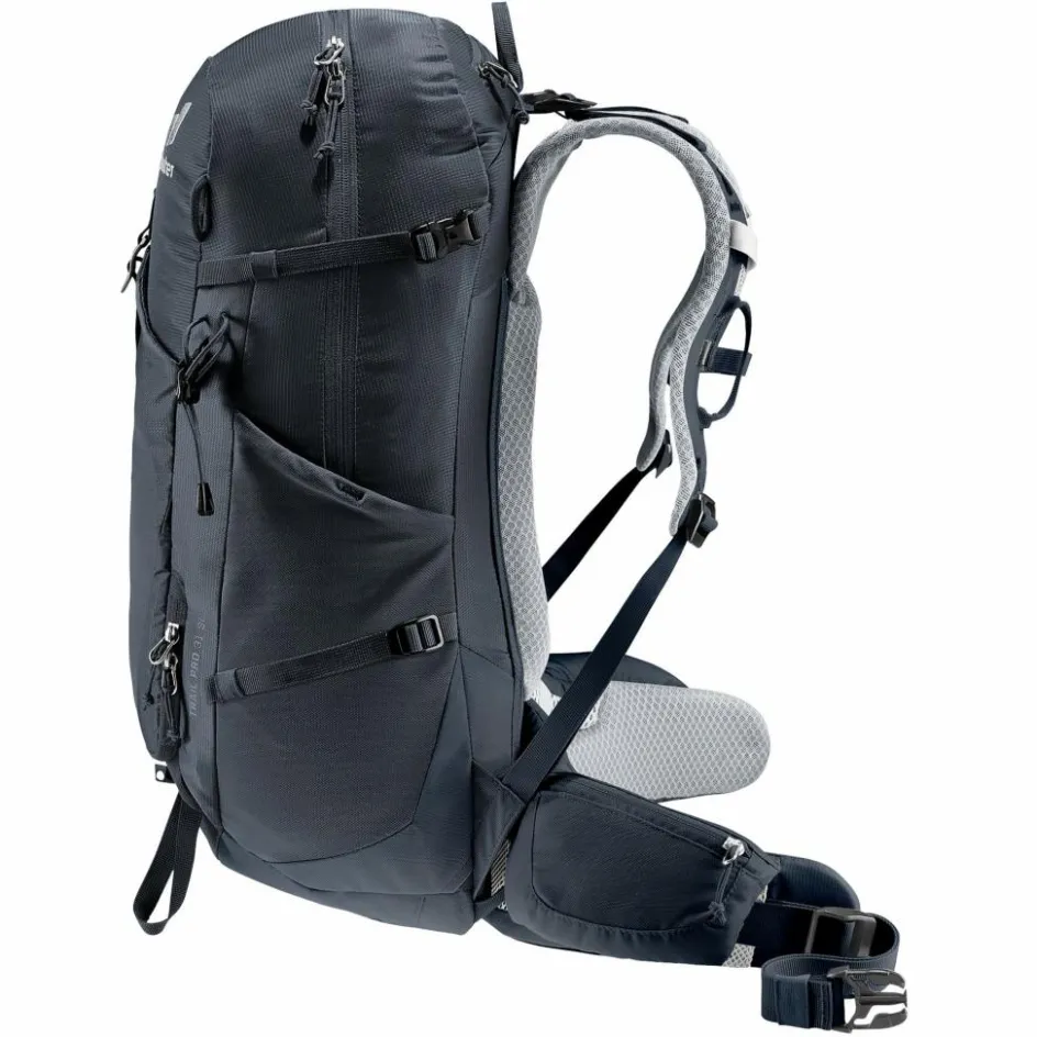 Das Airstripes Rückensystem mit geringer Auflagefläche und luftdurchlässigem, schnell trocknendem Air Spacer Mesh sorgt zusammen mit den perforierten Schulterträgern und Hüftflossen für maximale Belüftung, gute Lastverteilung und kompakten Sitz auf Mehrtagestouren mit Klettersteig. Dank Fixierungen an den Schulterträgern sind die Karabiner des Klettersteigsets stets griffbereit und das Material durch den großen Reißverschluss-Hauptfachzugang, die elastischen Seitentaschen und das separate Bodenfach gut sortiert und schnell verräumt.