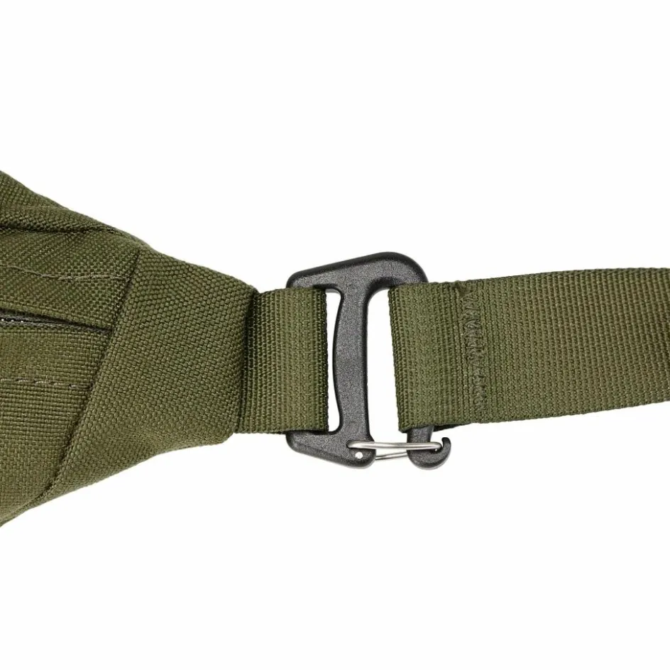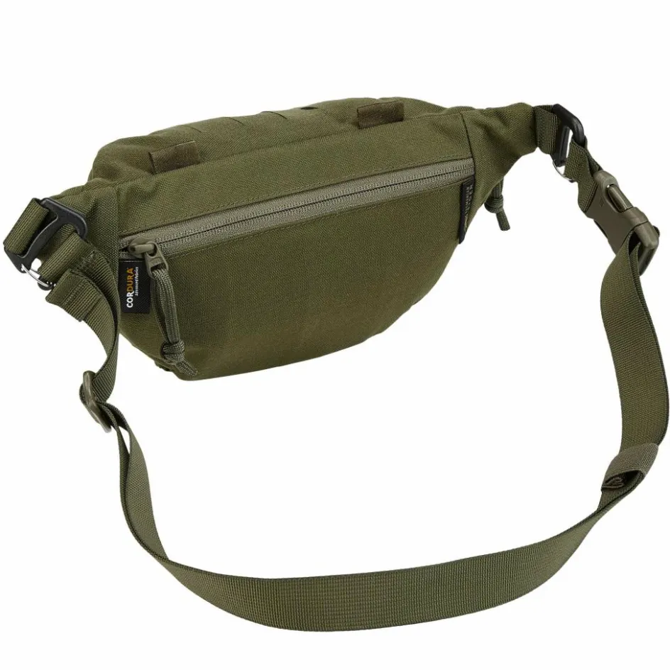Die Hüfttasche besitzt ein großes Hauptfach sowie jeweils ein RV-Fach vorne und auf der Rückseite. Im Hauptfach und auf dem Deckel befinden sich MOLLE-Laschen aus Klett bzw. Lasercut. Der Bauchgurt ist abnehmbar, sodass du die robuste Hüfttasche aus Cordura auch beispielsweise am Rucksack oder Gürtel befestigen kannst.