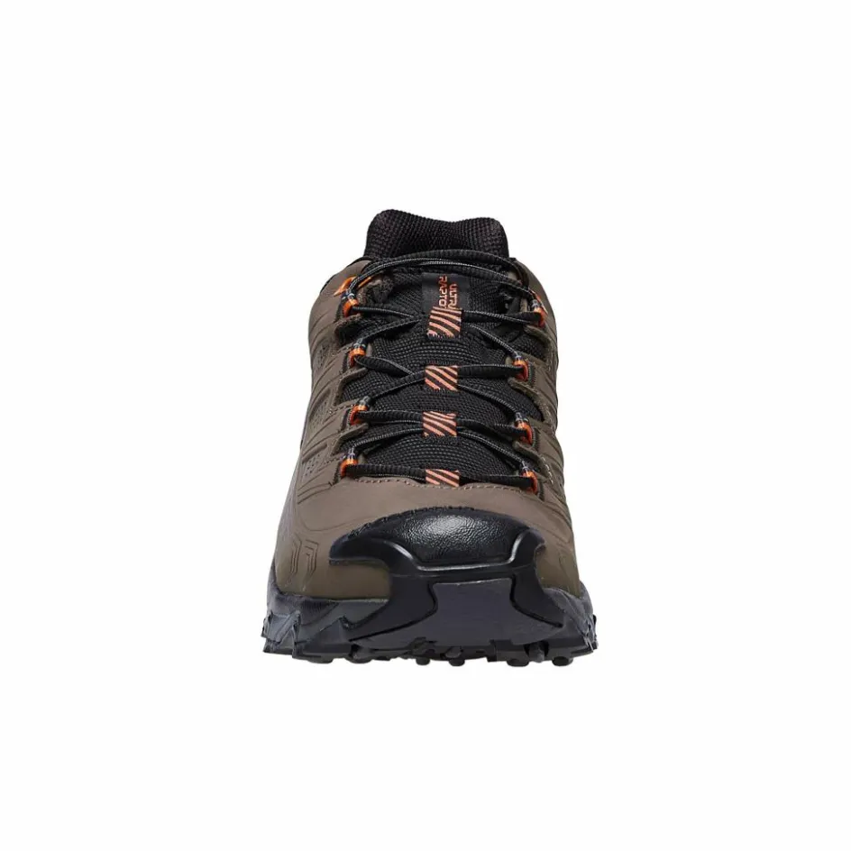 Also kommen wir zum Obermaterial. Hier kommt weiches, dadurch aber nicht weniger robustes Nubukleder zum Einsatz. Im Bereich der Schnürung wird es außerdem noch durch synthetische Verstärkungen ergänzt, die deinem Fuß im Schuh optimale Stabilität verleihen. Dieser insgesamt etwas steiferen und robusteren Konstruktion verleiht der sportliche Halbschuh den Umstand, als Hikingmodell durchzugehen.