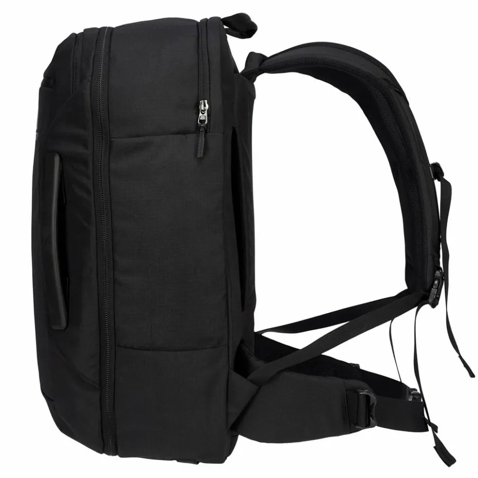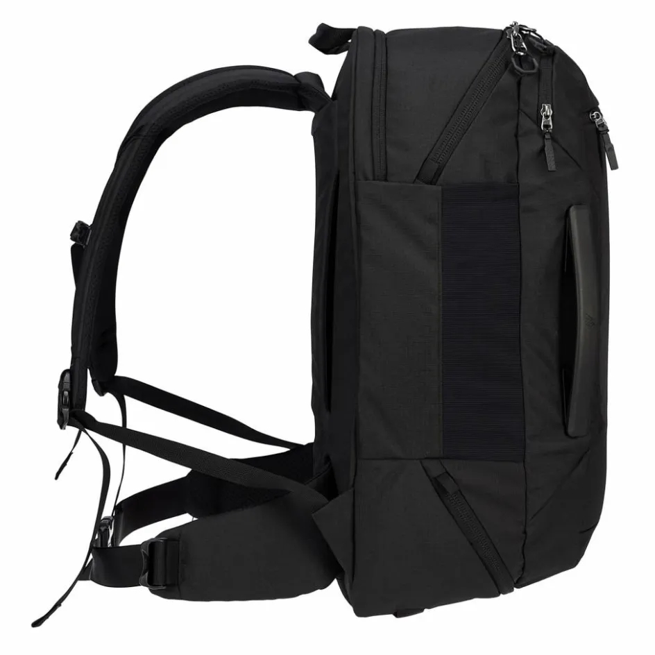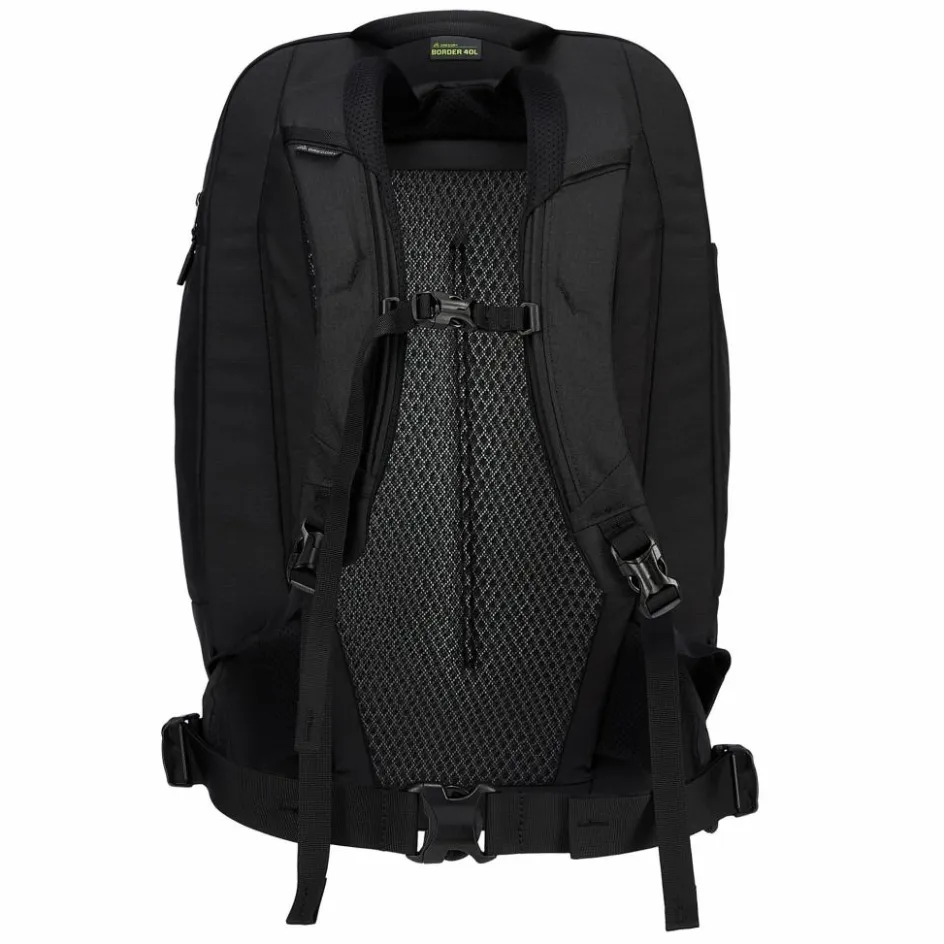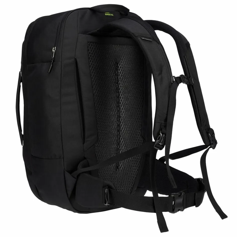 Das Tragesystem des Border Carry On 40 vereint großartige Belüftung mit weicher Polsterung, denn beim Kontaktrücken des Kofferrucksacks kommt luftiges 3D-Mesh zum Einsatz. Die Schultergurte und die Hüftflossen lassen sich bei Bedarf verstauen, wodurch der Border Carry On 40 am Flughafen auch problemlos als Gepäck aufgegeben werden kann. Nimmst du den Rucksack lieber mit an Bord, kannst du ihn auf dem Weg zum Gate dank der praktischen Aufstecklasche bequem am Teleskopgriff deines Rollkoffers befestigen. Und in der Kabine erleichtern dir zwei seitliche Griffe das Platzieren in der Gepäckablage.