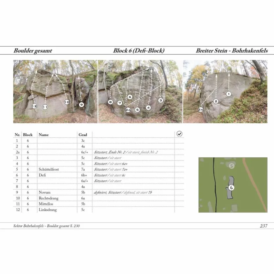 - Gesamtübersicht aller Parcoursboulder und zusätzlicher Probleme des jeweiligen Sektors mit Blockfotos und
