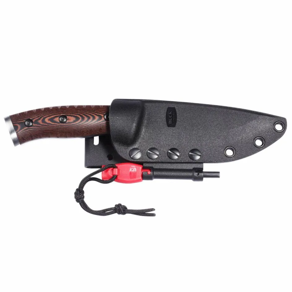 An der Seite der Scheide hat ein Feuerstarter seinen Platz. Der Griff des Starters ist mit einer Signalpfeife ausgerüstet. Zum Funken schlagen nutzt man die ausgeprägt große Schleifkerbe am Ende der Klinge. Die Kerbe fällt deshalb auch entsprechend scharfkantig aus.