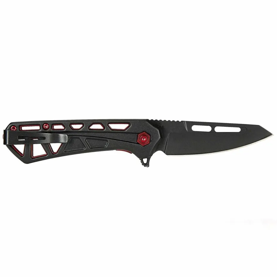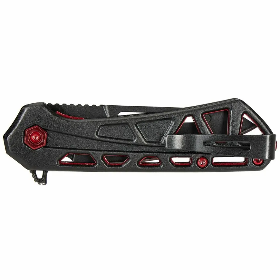 Mit einer Gesamtlänge von 15 cm, bringt das Taschenmesser gerade einmal 50 g auf die Waage. Der Hauptgrund dafür sind die mit großen Aussparungen versehenen, eloxierten Aluminium-Griffschalen. Sie werden durch rote Farbakzente ergänzt, die das Gesamtdesign auflockern. Der kugelgelagerte Flipper lässt die Klinge mühelos in Arbeitsposition gleiten, wo sie dank des Liner-Locks sicher verriegelt. Bei präzisen Arbeiten unterstützt die strukturierte Daumenauflage auf dem Klingenrücken eine sichere Handhabung. Für den Transport kannst du den verschraubten Hosentaschenclip sowohl links- als auch rechtsseitig an den Griffschalen befestigen, wodurch das Messer für Links- und Rechtshänder gleichermaßen schnell zur Hand ist.