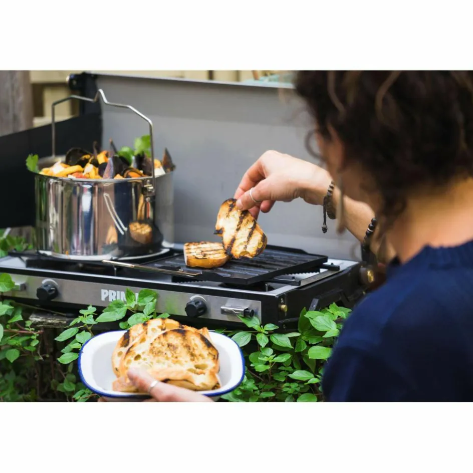 Diese Grillplatte mit Antihaftbeschichtung passt auf die Primus Gaskocher Tupike und Kinjia aber auch auf viele weitere Zweiflammkocher. Das Fett wird durch die Rinnen vom Grillgut weggeleitet.