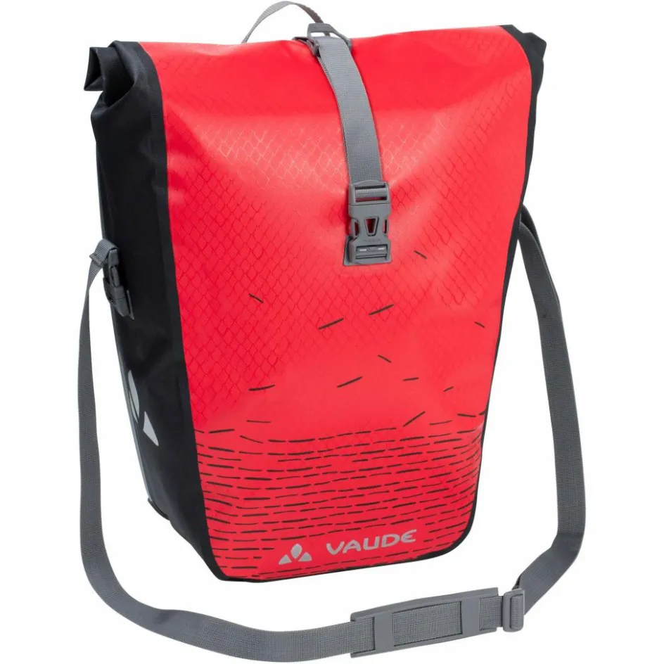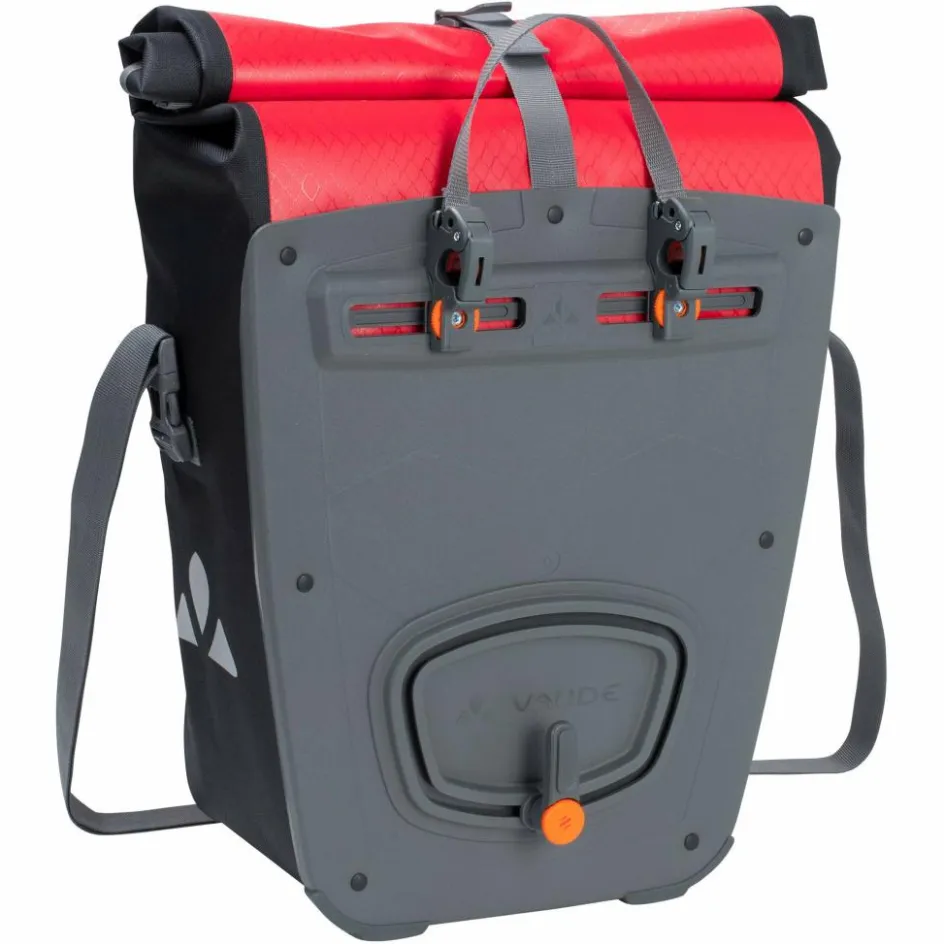 Die Fahrradtasche Aqua Back Print Single ist mit dem QMR-System ausgestattet: eine Schiene mit selbstsichernden Haken ist hier für die Verbindung zum Gepäckträger verantwortlich. Das System lässt sich mit Rohrdurchmessern von 8 bis 16 Millimetern verwenden und ist damit mit sehr vielen Gepäckträgern verwendbar. Die Haken lassen sich werkzeuglos auf ihrer Schiene verstellen. Außerdem kannst du die Tasche auch direkt am Haken abschließen.