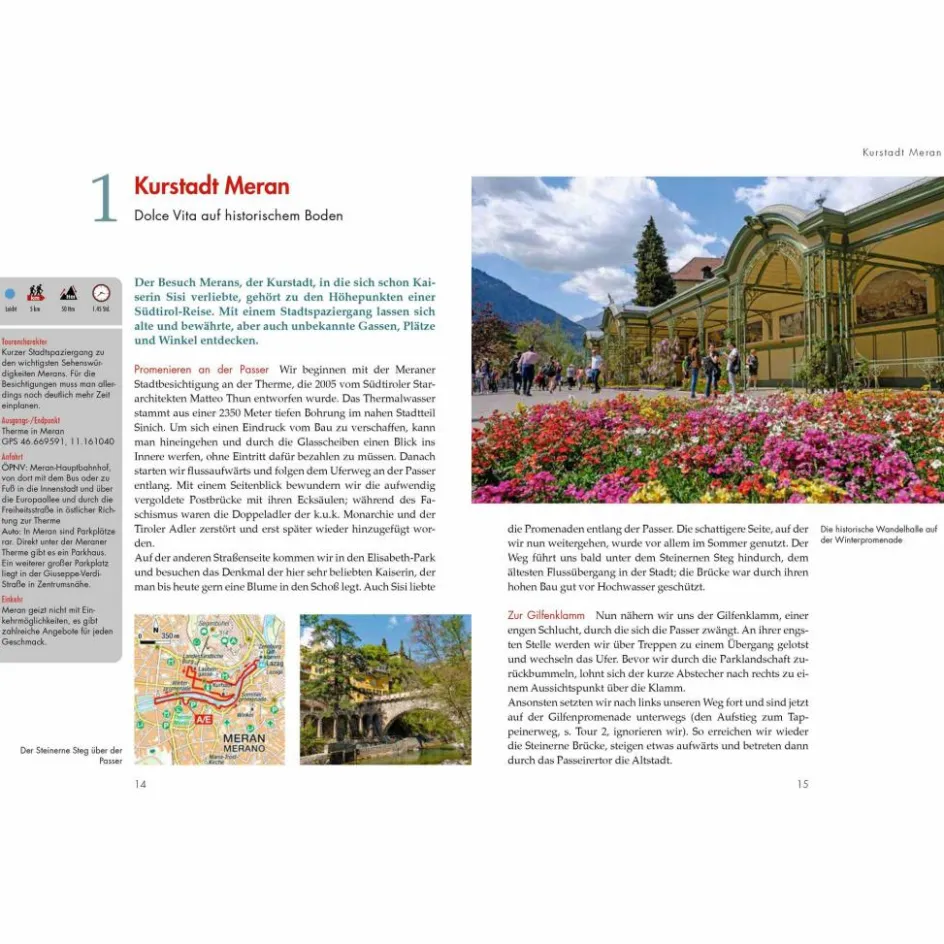 Sie geizen nicht mit Naturschönheiten: die Südtiroler Kurstadt Meran und ihre Umgebung. Dazu lockt in dem sonnenverwöhnten Talkessel meist ein ideales Wanderwetter. Perfekt, um in der Region zwischen Palmen und karger hochalpiner Bergwelt Wanderungen und Bergtouren zu unternehmen – mal mit Seilbahnhilfe, mal mit abwechslungsreicher Kraxelei. Die erlebnisreichsten Touren – über Waalwege, den Meraner Höhenweg, durch Schluchten hinauf zu gemütlichen Almen und hohen Gipfeln – sind in diesem Tourenführer versammelt.