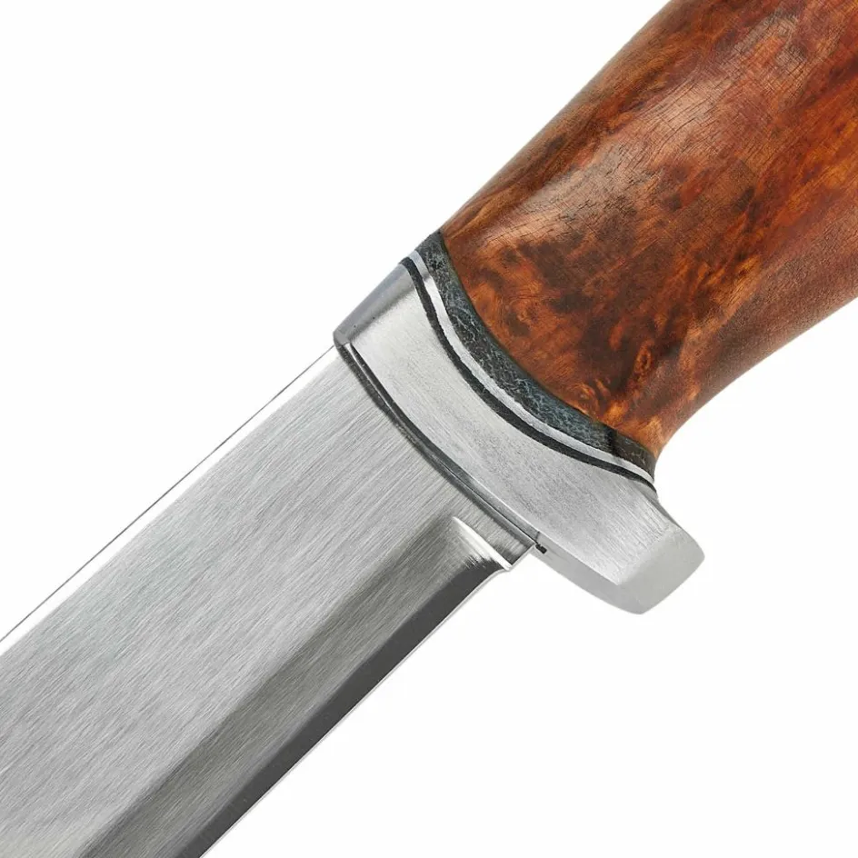 Optisch ein echter Hingucker! Die spiegelblank polierte Klinge ergänzt perfekt die rustikale Optik des Griffs aus poliertem und geöltem Maserbirkenholz, das mit schwarzen Einlagen am Fingerschutz versehen ist. Das Heft besteht aus einem Stück Maserbirke, das ergonomisch geformt ist und dadurch für ein besseres Handling sorgt. Mit einer Länge von 12,4 cm liegt es sehr gut in mittelgroßen und großen Händen.