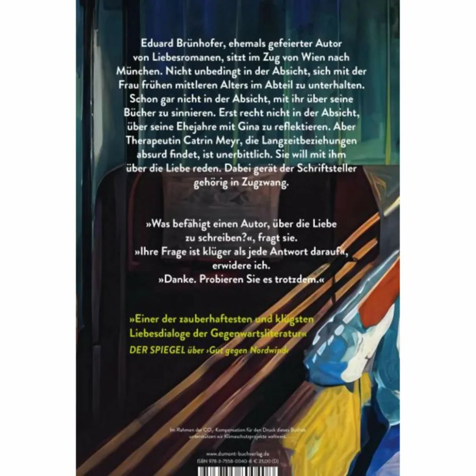 Eduard Brünhofer, ehemals gefeierter Autor von Liebesromanen, sitzt im Zug von Wien nach München. Nicht unbedingt in der Absicht, sich mit der Frau frühen mittleren Alters im Abteil zu unterhalten. Schon gar nicht in der Absicht, mit ihr über seine Bücher zu sinnieren. Erst recht nicht in der Absicht, über seine Ehejahre mit Gina zu reflektieren.