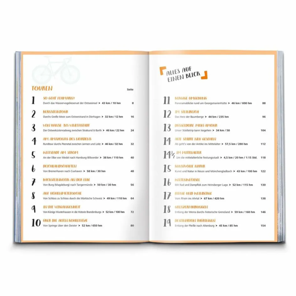 Hier ist für jeden die passende Radtour dabei: Die über ganz Deutschland verteilten Tagestouren führen zu landschaftlichen und kulturellen Highlights und bedienen sich dabei sowohl der beliebtesten Radwege als auch unbekannterer Routen. Bei jeder Tour finden sich Einkehrtipps, Anreiseinfos, Höhenprofil und Tourenkarte. Mit App und GPX-Download verbindet der Radtourenguide Inspiration auf dem Sofa mit einfacher Navigation vor Ort. Mit unserem Radtourenführer entdeckst du Deutschland neu aus ungewöhnlichen Perspektiven und mit spannenden Insights. Da bleibt nur eines: aufsatteln und losradeln!