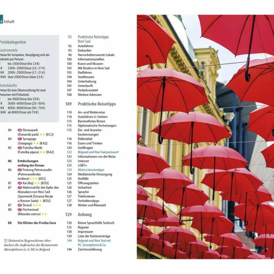 Die beiden größten serbischen Städte Belgrad und Novi Sad eint ihre Lage an der Donau und ihre bunte Kulturszene. Über beiden thront eine geschichtsträchtige Festung, von deren Mauern man einen grandiosen Ausblick genießt. Das dynamische Belgrad punktet mit einem lebendigen Nachtleben, in das man etwa in der Ausgehmeile Skadarlija oder auf den Splavovi genannten Partybooten eintauchen kann. In Novi Sad, der Hauptstadt der Vojvodina, verheißen die versteckten Passagen der Altstadt Shoppingfreuden. In der Umgebung von Novi Sad locken Salai, urige Landgasthöfe, mit deftiger serbischer Küche. Die orthodoxen Klöster der Fruka Gora zeichnen sich hingegen durch Stille und Spiritualität aus.