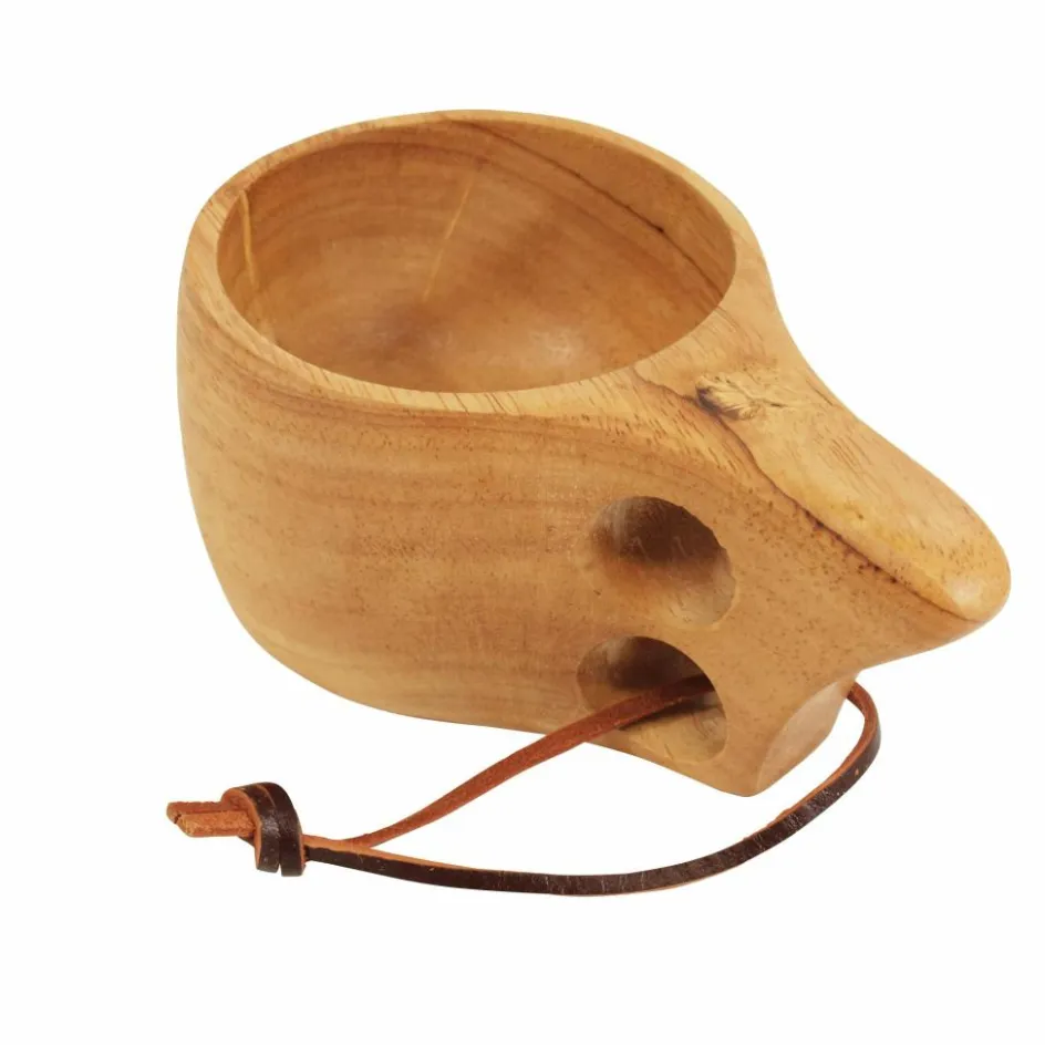 Finnische Holztasse mit klassischem Zwei-Finger-Henkel und Lederkordel zum Aufhängen. Aus der Kuksa lässt sich hervorragend Tee, Kaffee aber auch kräftigere Getränke genießen.