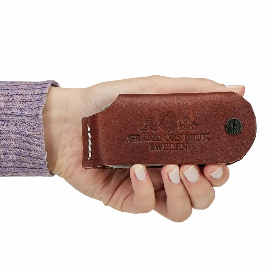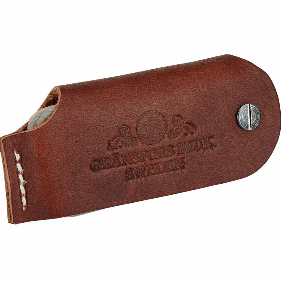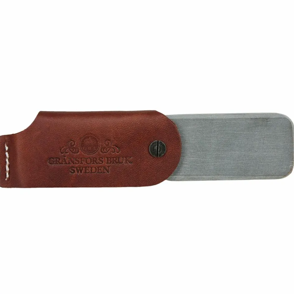 Der Schleifstein steckt in einer robusten Lederhülle, aus der du den Stein seitlich herausklappen kannst. Das pflanzlich gegerbte Leder aus Tärnsjö schützt den Naturwetzstein beim Transport und verfügt über eine Schlaufe auf der Rückseite, um ihn am Gürtel oder Rucksack zu befestigen.