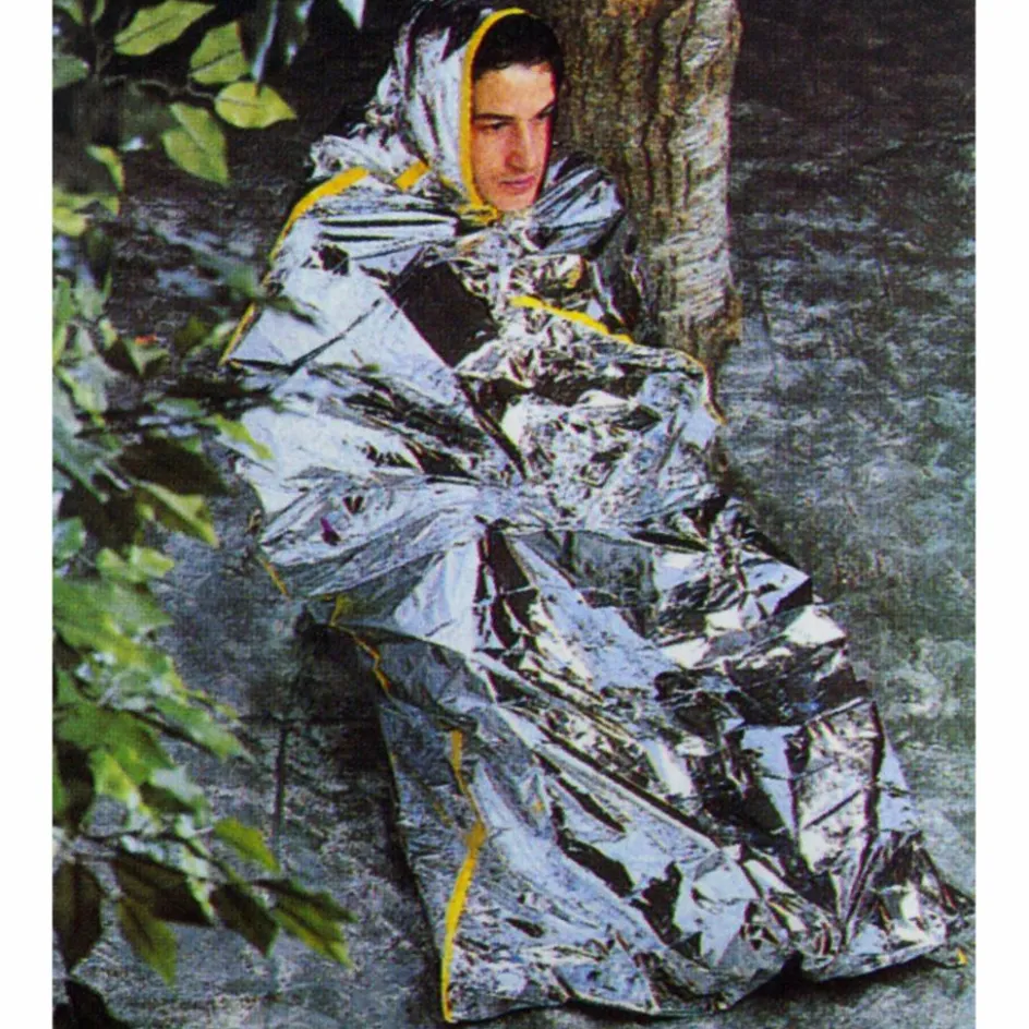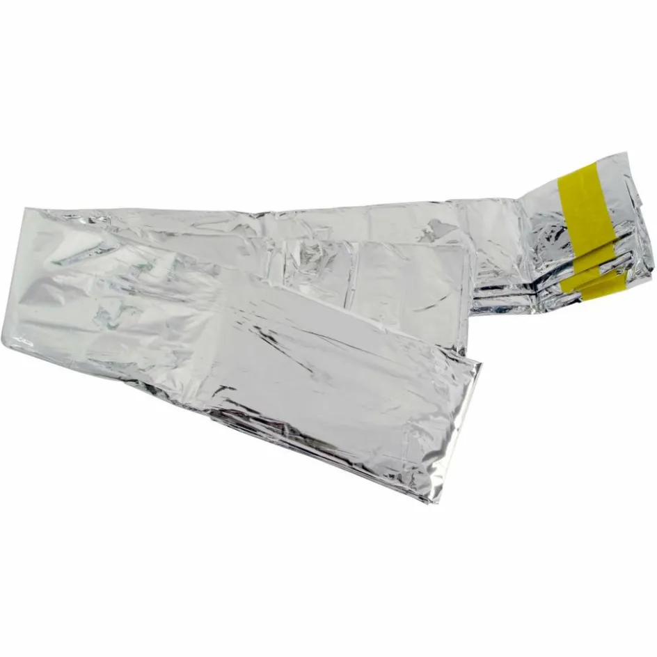 Rettungsdecke in Sack-Form. Umschließt die Person vollständig, reduziert damit die Gefahr der Unterkühlung und hält Wind und Nässe ab. Ideal geeignet für die Erstversorgung und den Transport.