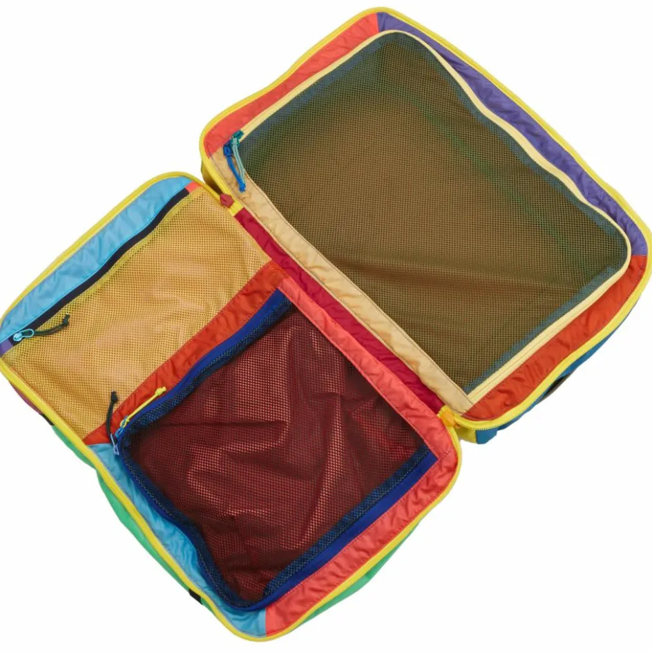 Den Allpa 42L kannst du komplett aufklappen und wie einen Koffer bepacken. Vier Netzfächer im Inneren sorgen dabei für Ordnung und Übersicht. Ergänzend gibt es ein separates Elektronikfach, in dem dein Laptop, Tablet und die Ladekabel verstaut werden können. Pass, Geld und Sonnenbrille passen in das praktische Kopffach.