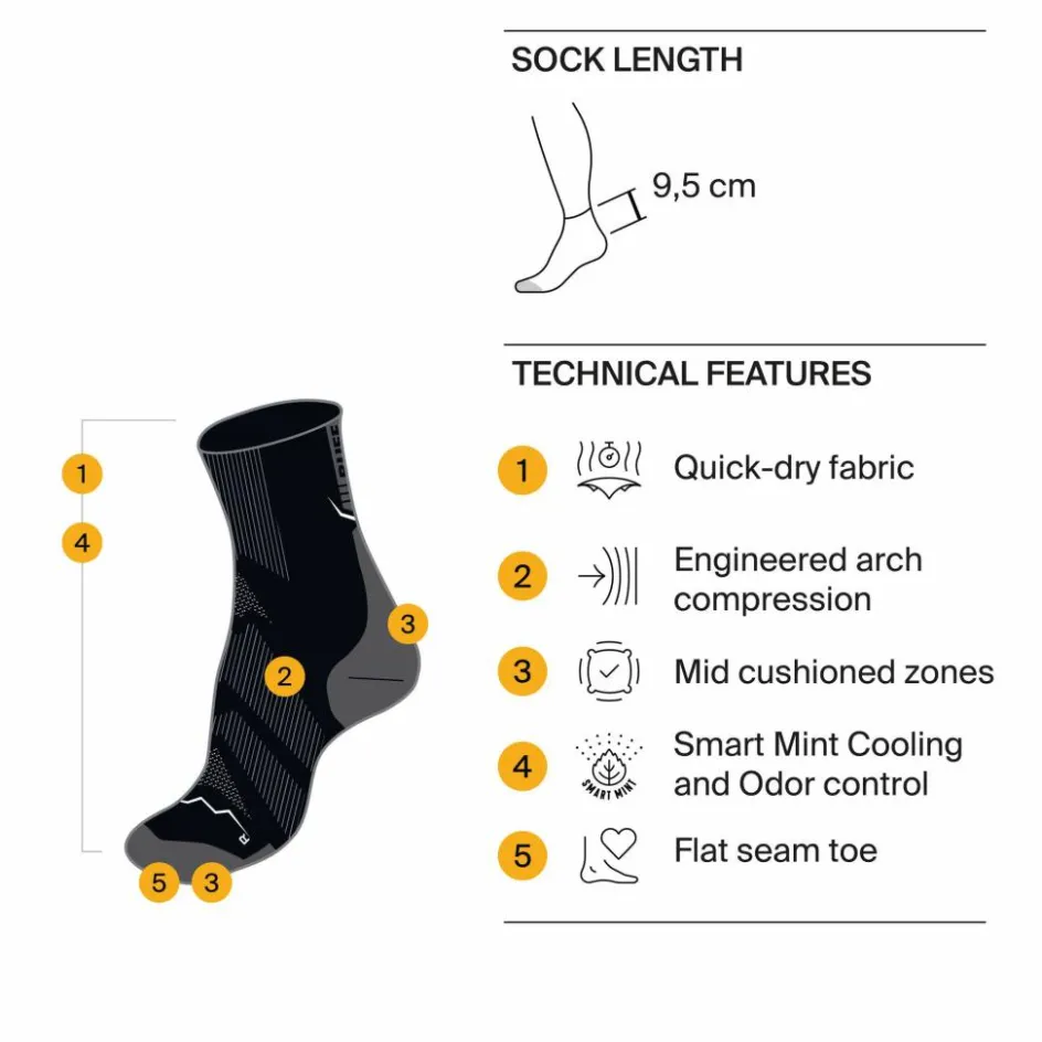 Bei den Dryflx Quarter trifft atmungsaktives, schnelltrocknendes Material auf geruchshemmende Eigenschaften durch pflanzenbasiertes HeiQ Smart-Mint-Cooling. Perfekt für schnelle Läufe. Zudem bietet die Fußgewölbe-Kompression Stabilität, während die leichte Polsterung Blasen verhindert. Mit flachen Nähten und einer mittelhohen Passform bieten diese Laufsocken eine tolle Balance zwischen Komfort und Unterstützung – vom ersten Schritt bis ins Ziel.