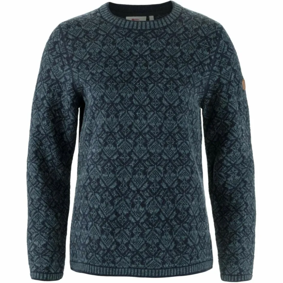 Das hübsche Muster ist von skandinavischer Folklore inspiriert. Rippstrick an Bund und Ärmeln sowie am Halsausschnitt runden den schönen Look ab. Die ansonsten flachen Nähte unterstreichen das gemütliche Tragegefühl. Auch das Fjällräven Fuchslogo aus Leder am Ärmel fehlt natürlich nicht.