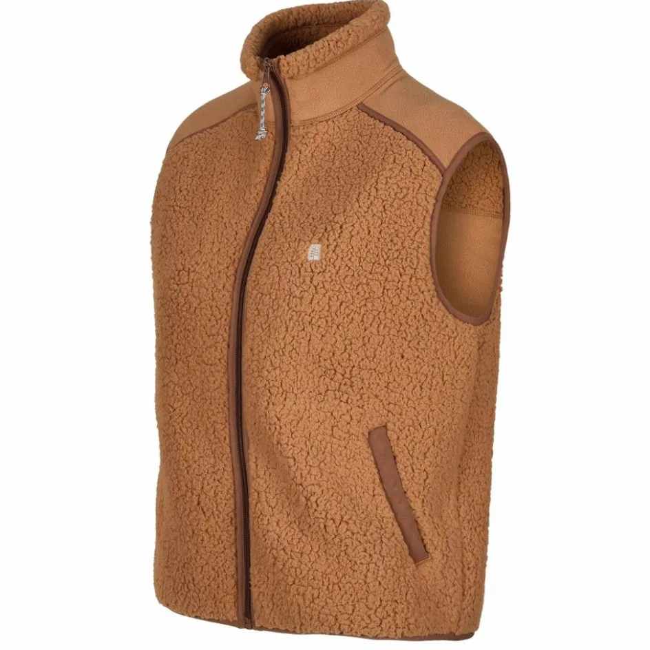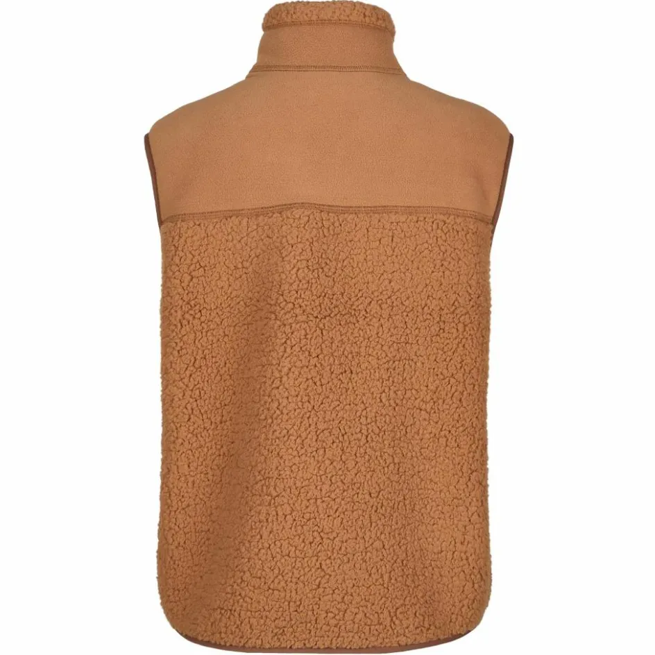 Gefertigt ist die modische Weste aus Polyester, von dem die Hälfte recycelt ist. Das weich aufgebürstete Teddy-Fleece-Material liegt sehr angenehm auf der Haut. Noch dazu sorgt die Pile-Struktur für guten Wärmerückhalt bei herbstlichem Wetter.