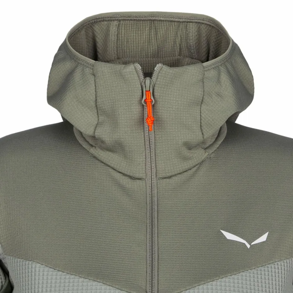 Die Jacke ist aus zwei verschiedenen Polarlite-Materialien gefertigt. Das Hauptmaterial besteht aus Polarlite Waffle, ein robustes Fleece-Material mit einer groben Waffelstruktur. Durch die spezielle Struktur bilden sich Luftkammern, die deine Körperwärme besonders effektiv speichern, ohne dass die Jacke zu schwer wird. Im Brust- und Schulterbereich sowie an der Kapuze und unter den Armen kommt stark elastisches Polarlite Grid zum Einsatz, das dank seiner weich aufgebürsteten Innenseite sehr angenehm auf der Haut liegt. Das Material ist etwas dünner und lässt überschüssige Wärme und Feuchtigkeit zügig entweichen. So hast du es nach hoher körperlicher Belastung schnell wieder schön trocken in der Jacke und kühlst nicht aus, wenn du eine Pause einlegst.
