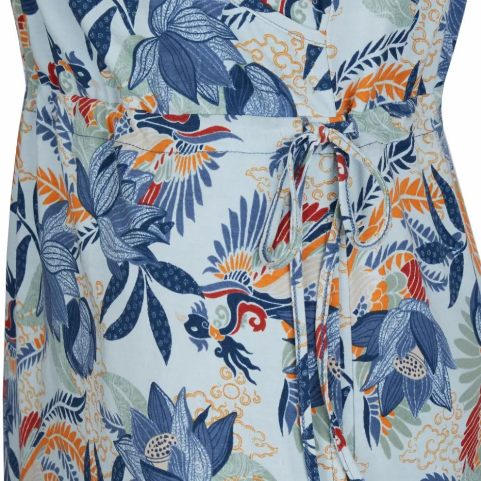 Das Kleid hat lediglich die Optik eines Wickelkleides, ist an den entscheidenden Stellen aber fixiert bzw. am Ausschnitt mit einem gut haltenden Druckknopf ausgestattet. So kannst du dich frei bewegen und brauchst keine Angst vor ungewollten Einblicken haben. Der Schnürzug auf Taillenhöhe ermöglicht dir eine individuelle Weitenregulierung. Auch sehr praktisch: Neben zwei Einschubtaschen verfügt das Kleid außerdem über eine versteckte Reißverschluss-Tasche, in der du Geldscheine, Karten oder andere wichtige Kleinigkeiten sicher verstauen kannst. Der schöne Naturprint versprüht sommerliche Frische und Fröhlichkeit.