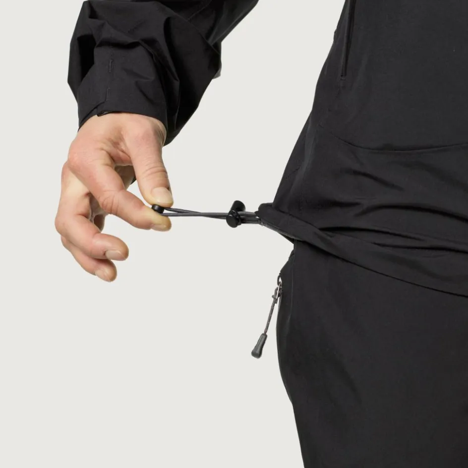 Die Regenjacke besteht aus leichtem, 2,5-lagigem Gore-Tex Paclite. Das Material ist zuverlässig wind- und wasserdicht bei einer gleichzeitig hohen Atmungsaktivität. So trägt sich die Jacke auch beim schweißtreibenden Einsatz sehr angenehm. Brauchst du dennoch etwas Frischluft-Zufuhr, kannst du einfach die Belüftungs-Reißverschlüsse öffnen und dich schnell abkühlen lassen. Die Reißverschlüsse befinden sich nicht direkt unter den Achseln, sondern sind etwas tiefer angebracht. So stören sie nicht, auch wenn du einen Rucksack trägst. Weiterer Komfort-Pluspunkt: Das Material hat eine geschmeidige Außenseite und eine eher lockere Passform. So kannst du bei kaltem Wetter problemlos einen wärmenden Fleecepullover unter der Jacke tragen.