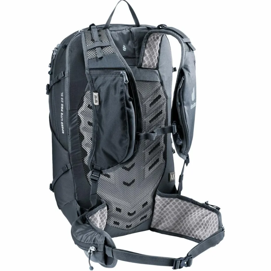 Seine sportive Natur merkt man dem Speed Lite Pro 23 SL schon an seiner durchdachten Raumaufteilung an. So bietet der Tagesrucksack insgesamt vier Fächer auf den Schultergurten und Hüftflossen, damit du auch mit geschultertem Rucksack an eine Softflask (siehe Zubehör), das Handy oder den Energieriegel kommst. Das Tragesystem ist ebenfalls für bewegungsintensive Aktivitäten ausgelegt. Ergonomische Schultergurte und ein körpernah aufliegender Kontaktrücken sorgen für einen stabilen Sitz, während Belüftungskanäle, Perforationen und ein Meshbezug ausreichend Luft an Schultern und Rücken lassen. Mit 640 g ist der Tagesrucksack zudem ein echtes Leichtgewicht.