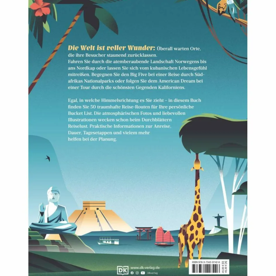 Einmal im Leben die Polarlichter in Island bestaunen, einmal auf einer Afrika-Safari die Big Five in freier Wildbahn sehen und einmal die Pyramiden von Gizeh besuchen: In diesem ganz besonderen großformatigen Reiseführer haben wir 50 unvergessliche Reisen rund um den Globus für Sie zusammengestellt – mit allen Informationen, die Sie für die Planung und Durchführung Ihrer Traumreise benötigen. Lassen Sie sich von den atmosphärischen Fotos und liebevoll gezeichneten Illustrationen begeistern und finden Sie Ihr nächstes Reiseziel! „50 unvergessliche Reisen, die man gemacht haben sollte“ ist das perfekte Reisebuch und Geschenk für alle Weltenbummler, Fernweh-Geplagten und Reiselustigen!