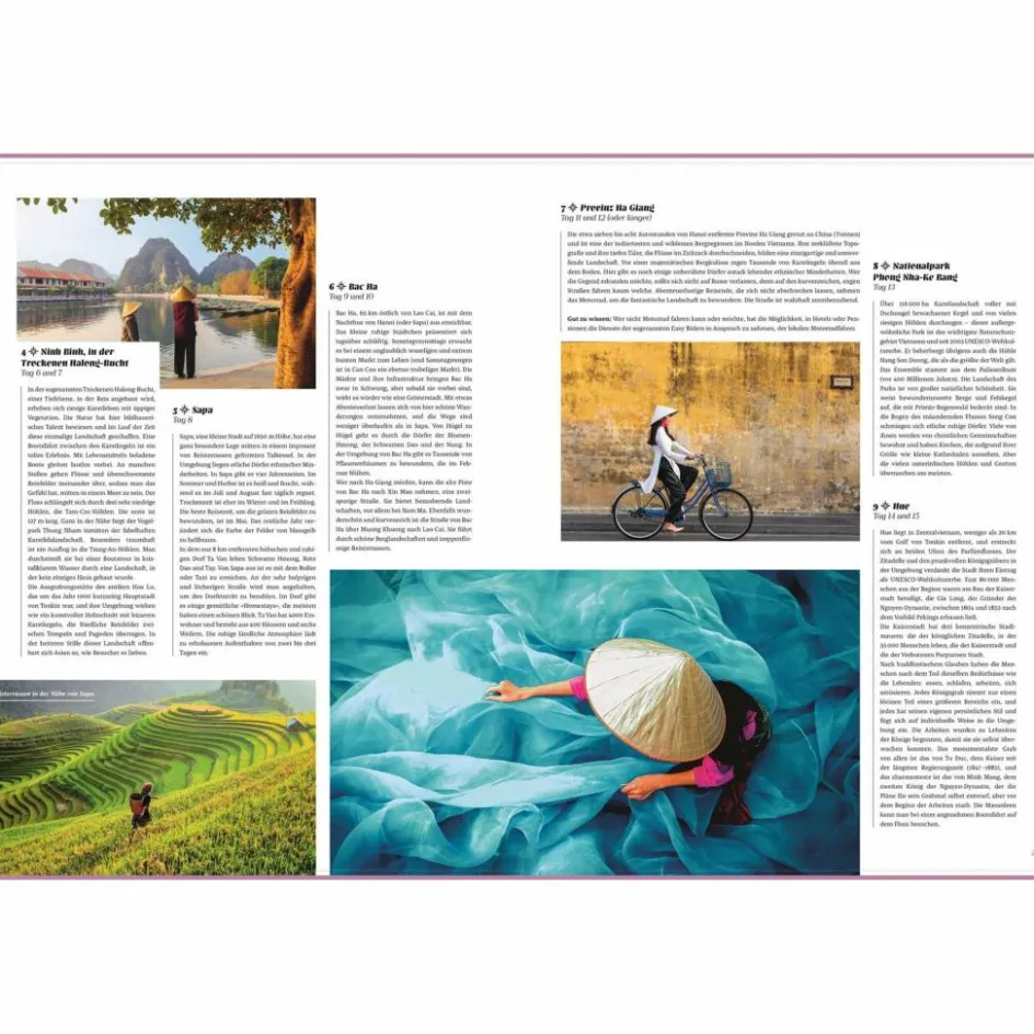 Drei Wochen Rundreise durch Peru, eine Woche Portugal oder lieber ein mehrtägiger Städtetrip nach Venedig? Hier ist für jedes Budget und jeden Reisetyp das passende Abenteuer dabei, ob Naturliebhaber*innen, Städtereisende, Strandurlauber*innen oder Backpacker. Jede Reise-Beschreibung führt Sie an die wichtigsten Sightseeing-Spots und Highlights der Reiseorte und enthält Hinweise auf weitere sehenswerte Stopps entlang der jeweiligen Route. So startet die zweiwöchige Vietnam-Reise in Hanoi und führt sie über die Bucht von Halong und Hue bis nach Hoi An. Und für alle, die noch mehr Zeit auf ihrer Reise zur Verfügung haben, werden zwei zusätzliche Tage auf den Cham-Inseln vorgeschlagen.