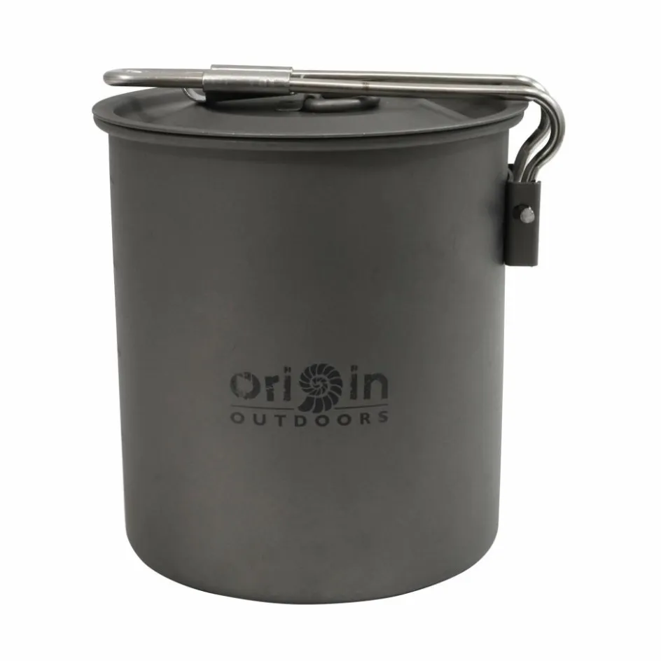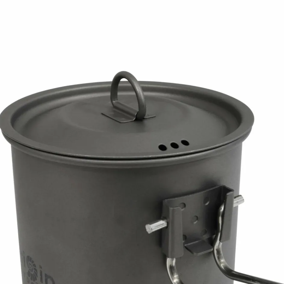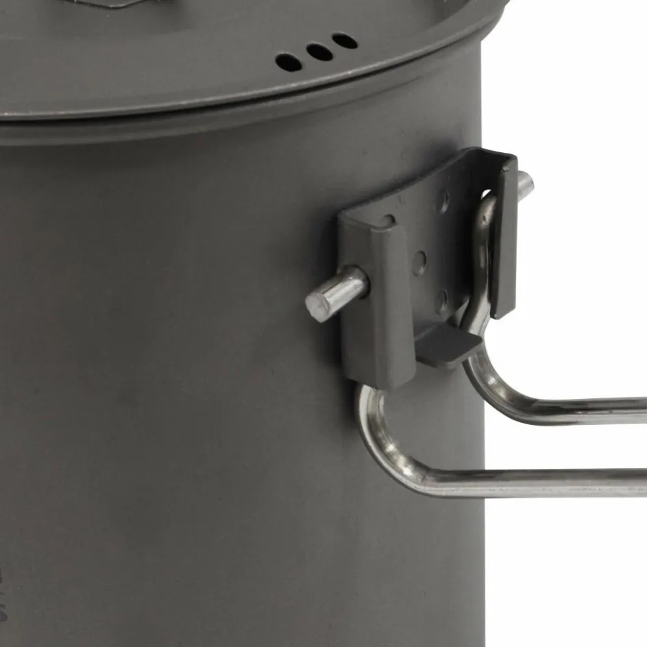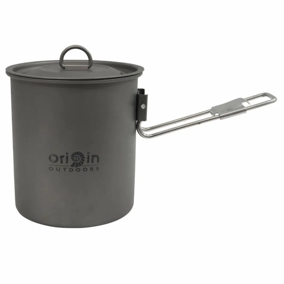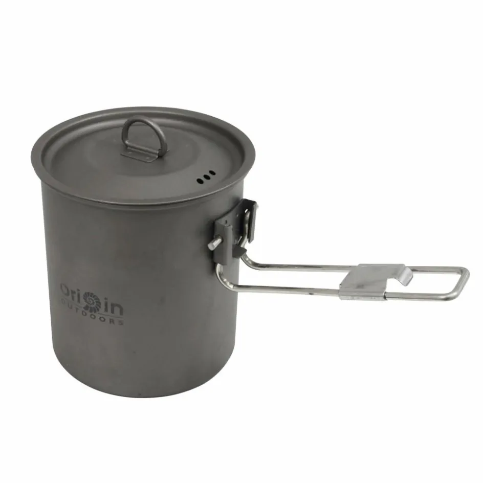 Sehr leichter Campingtopf mit 750 ml Volumen aus Titan. Ausgestattet mit einem Klappgriff und einem Deckel mit Ausgießer.