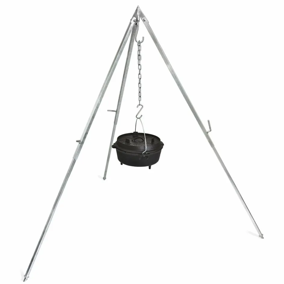 Dieses Dreibein eignet sich zum Kochen über der Feuerschale und trägt selbst schwere Gulaschtöpfe und Dutch Ovens bis zu 40 kg. Die Höhe ist durch teleskopierbare Beine und eine Kette verstellbar.