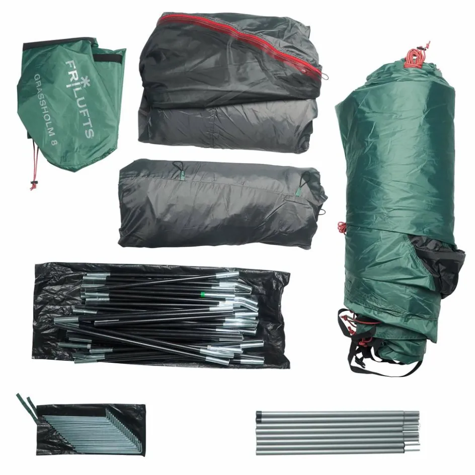 Das Grassholm 8 bietet Platz für große Familien. Trotz der Größe lässt es sich zu zweit gut aufbauen. Alle Gestängebögen und Kanäle sind farblich gekennzeichnet, was den Aufbau vereinfacht. Die beiden Innenzelte können für den Auf- und Abbau im Innenzelt verbleiben. So werden sie auch beim Aufstellen im Regen nicht nass.