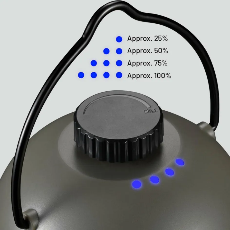 Der fest verbaute Li-Ion-Akku besitzt eine Kapazität von 4.000 mAh und versorgt die Lampe mit bis mindestens 8 Stunden und maximal 65 Stunden mit Strom. Die Zeit ist abhängig von der gewählten Helligkeitseinstellung, die du stufenlos über den Drehregler auf der Gehäuseoberseite vornehmen kannst. Eine Akkustandanzeige, bestehend aus vier LEDs gibt dir jederzeit einen Überblick über die verbleibende Akkukapazität (jede LED steht für 25 % Ladezustand).
