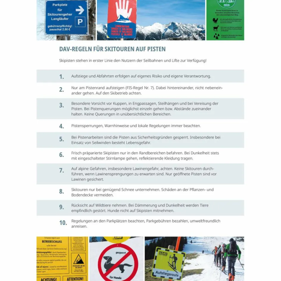 Die Skitouren-Lehrpfade und der Skitourenpark vermitteln von der Steigtechnik bis zur Lawinenkunde wichtiges Grundwissen für die zwölf Touren auf aufgelassenen Pisten und 21 leichten Skitouren. Das Zielgebiet erstreckt sich auf Oberbayern, das Allgäu und Tirol, manche Regionen eignen sich dank ihrer Tourendichte ideal für den Kurzurlaub. Einige Ziele sind auch bequem mit den öffentlichen Verkehrsmitteln erreichbar.