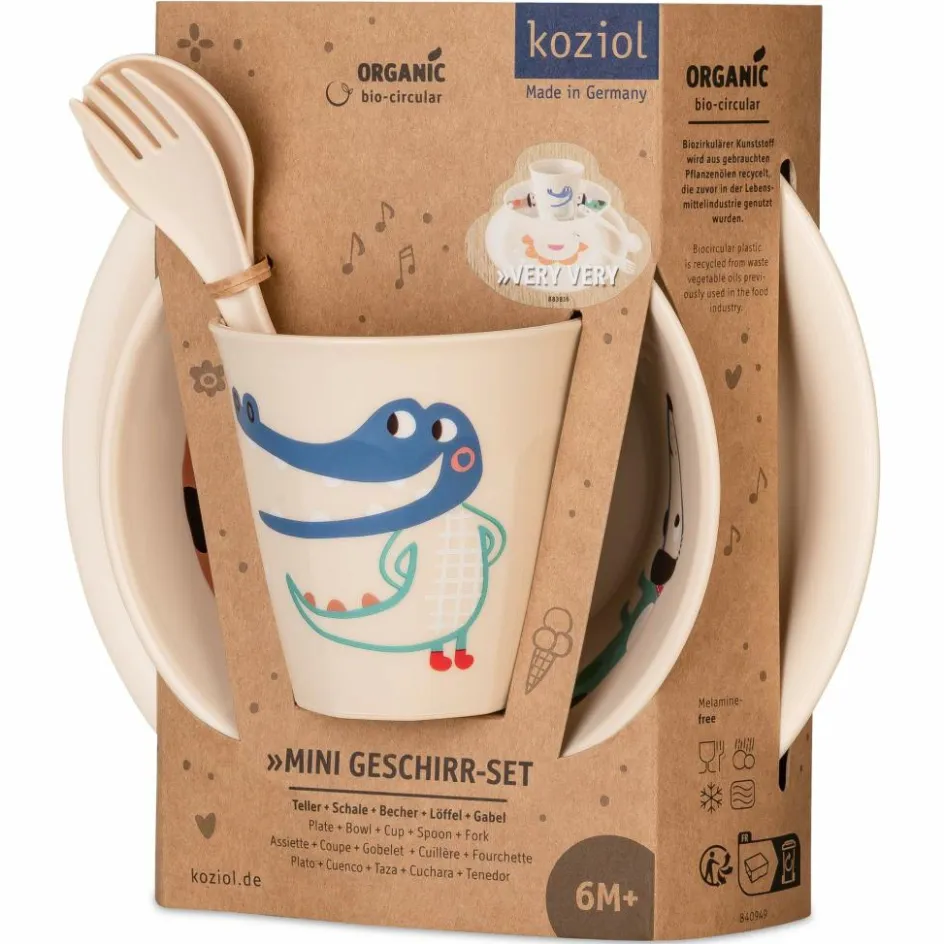 Dieses liebevoll verzierte, fünfteilige Geschirrset umfasst Teller, Becher, Müslischale, Löffel und Gabel. Es besteht aus bruchsicherem Kunststoff und wird in Deutschland hergestellt.