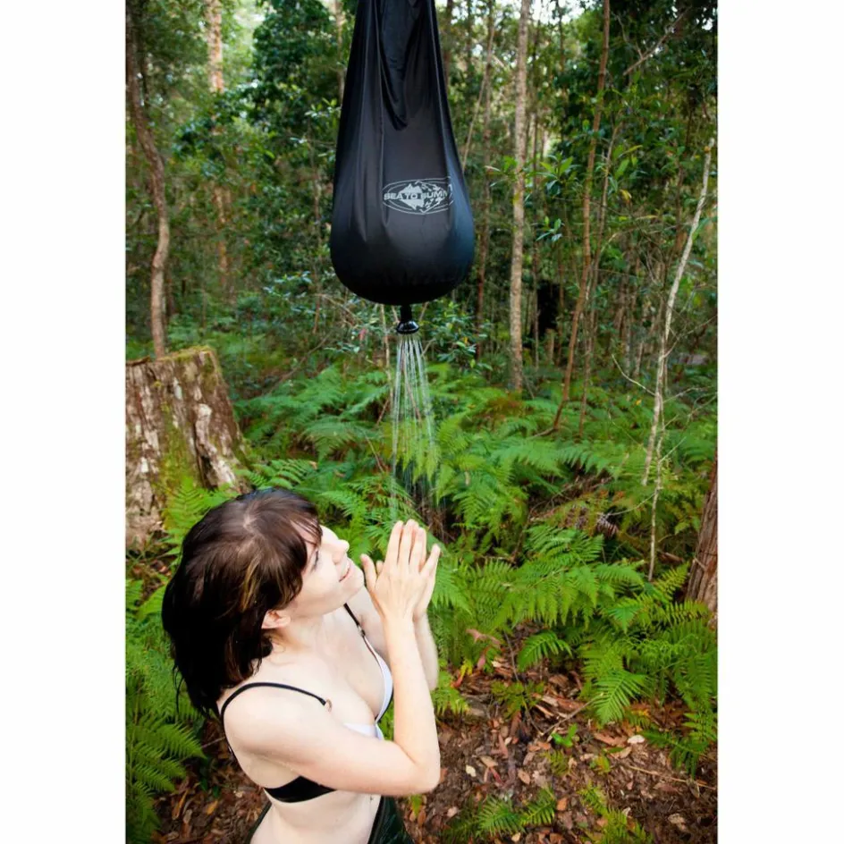 An einer am Rollverschluss befestigten 5,5 m langen Leine lässt sich die Dusche über einen Ast gehängt, bequem in die richtige Höhe ziehen. Die Dusche kann man direkt mit warmem Wasser füllen oder ca. eine Stunde vor dem Duschen ins Sonnenlicht hängen.
