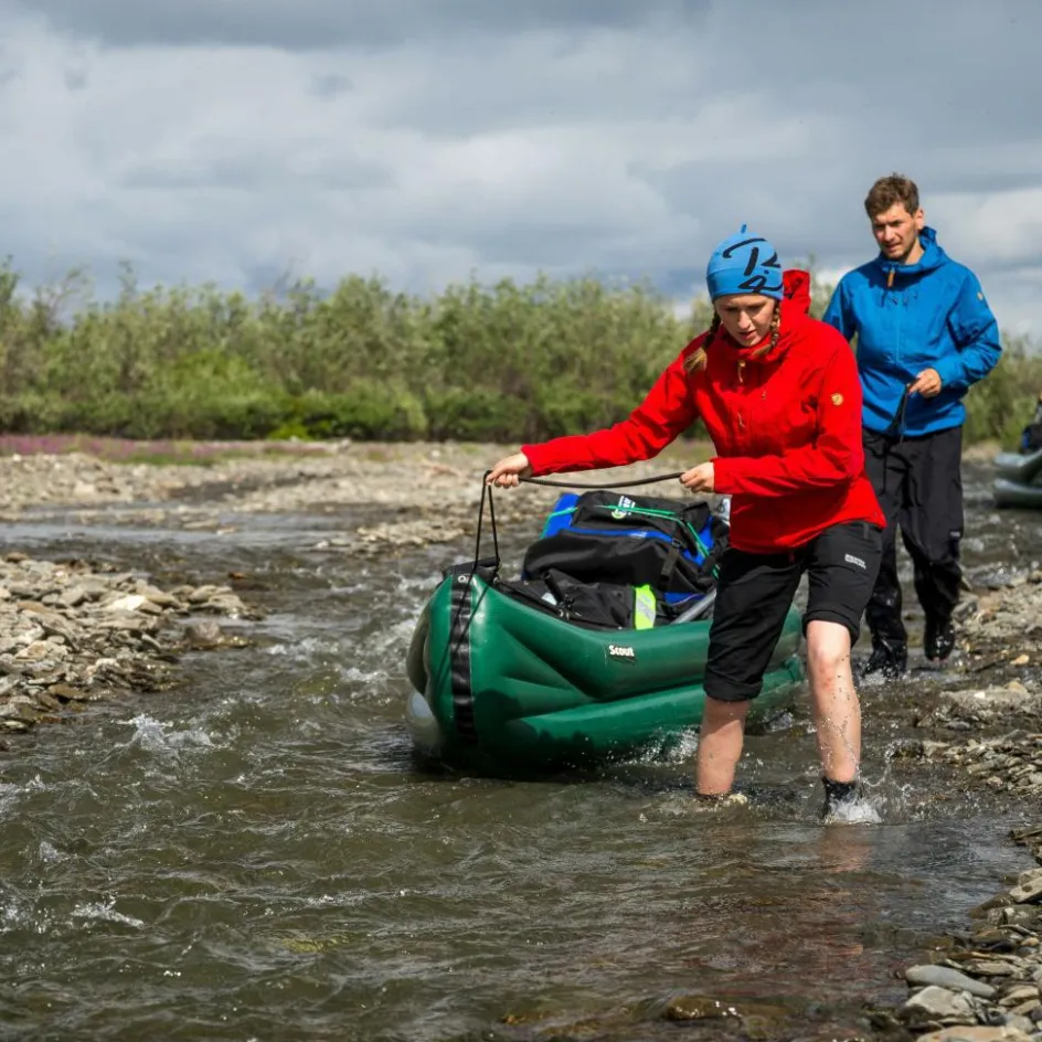 An Bug und Heck befinden sich Sicherheitsleinen sowie Rohrgriffe, mit denen das Boot einfach umgesetzt werden kann. Die Pumpe kann mit elastische Schlaufen innen an der Bootswand befestigt werden, so kann sie bei leichtem Wildwasser nicht über Bord gehen. Besonders praktisch ist der selbstlenzende Boden: Der „Rüssel“ wird zum Lenzen nach unten gedrückt; zum Verschließen stülpst du ihn nach innen und schließt ihn einfach per Rollverschluss – wie einen Packsack.