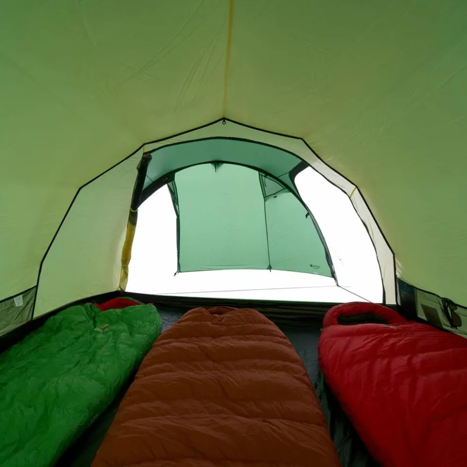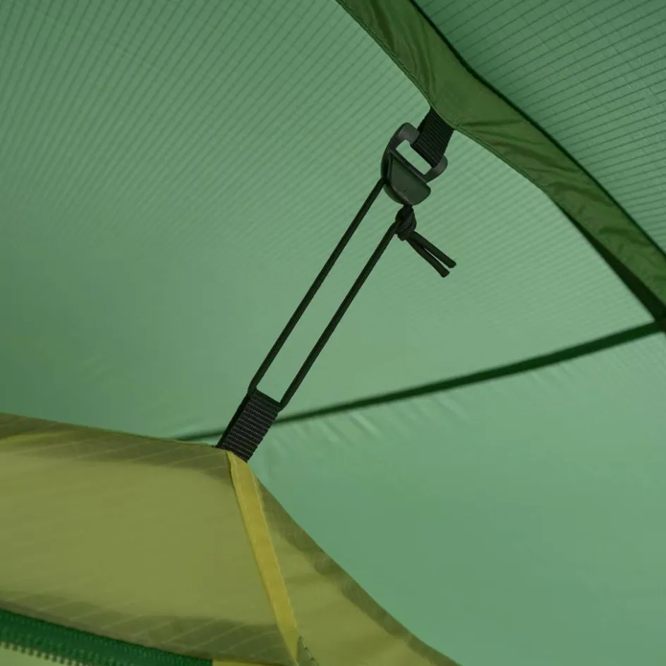 Das Zelt kannst du zu zwei Seiten betreten. Rucksäcke, Taschen und andere Ausrüstungsgegenstände finden ihren Platz in der großzügig geschnittenen Apsis. Ist es besonders warm, kannst du die Apsis bis zum ersten Gestängebogen aufrollen und für maximalen Luftaustausch sorgen. Vier seitliche Lüfter garantieren beste Belüftung bei schlechtem Wetter.