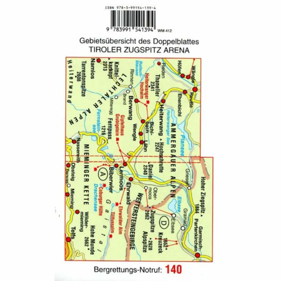 Die beiden Seiten dieser neuen Karte zeigen aber auch die angrenzenden Gebiete um Garmisch-Partenkirchen, Berwang und den Plansee, die östlichen Lechtaler Alpen und das Mieminger Plateau mit allen Wanderwegen, Rad- und Mountainbikerouten, touristische Attraktionen, Hütten und Einkehrstationen, plastisch und im augenfreundlichen Maßstab 1:25 000.