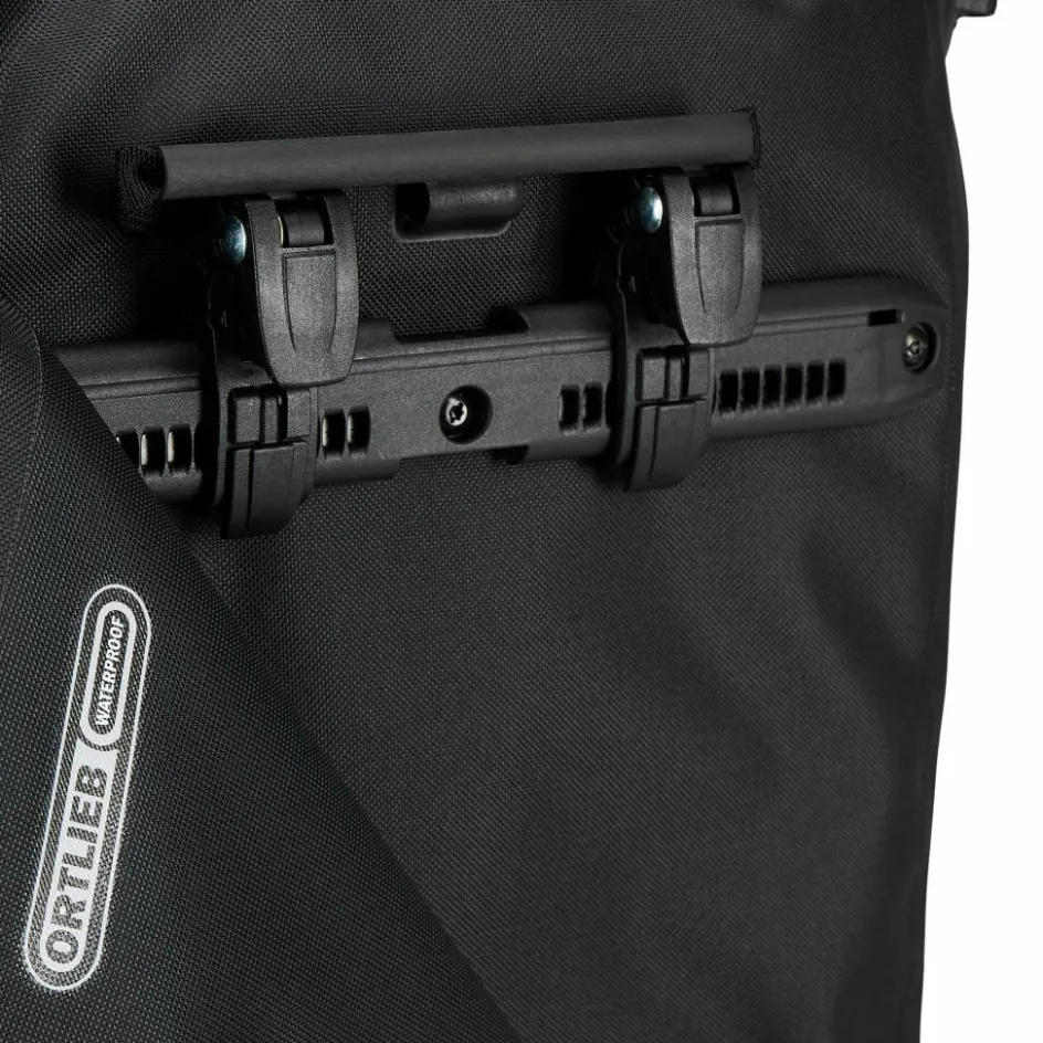 Aufhängung für Gepäckträger mit einem Rohrdurchmesser von 8 bis 16 mm. Die beiden oberen Haken lassen sich werkzeugfrei auf der aus einem Stück gefertigten Schiene verschieben und durch Anheben des Tragegriffs öffnen. Der untere Arretierungshaken ist ebenfalls auf einer halbelliptischen Schiene individuell anpassbar und werkzeugfrei in 15-Grad-Schritten drehbar. Ein Scheuerschutz im unteren Bereich der Taschen und an der Auflagefläche des Gepäckträgers beugt Abrieb vor.