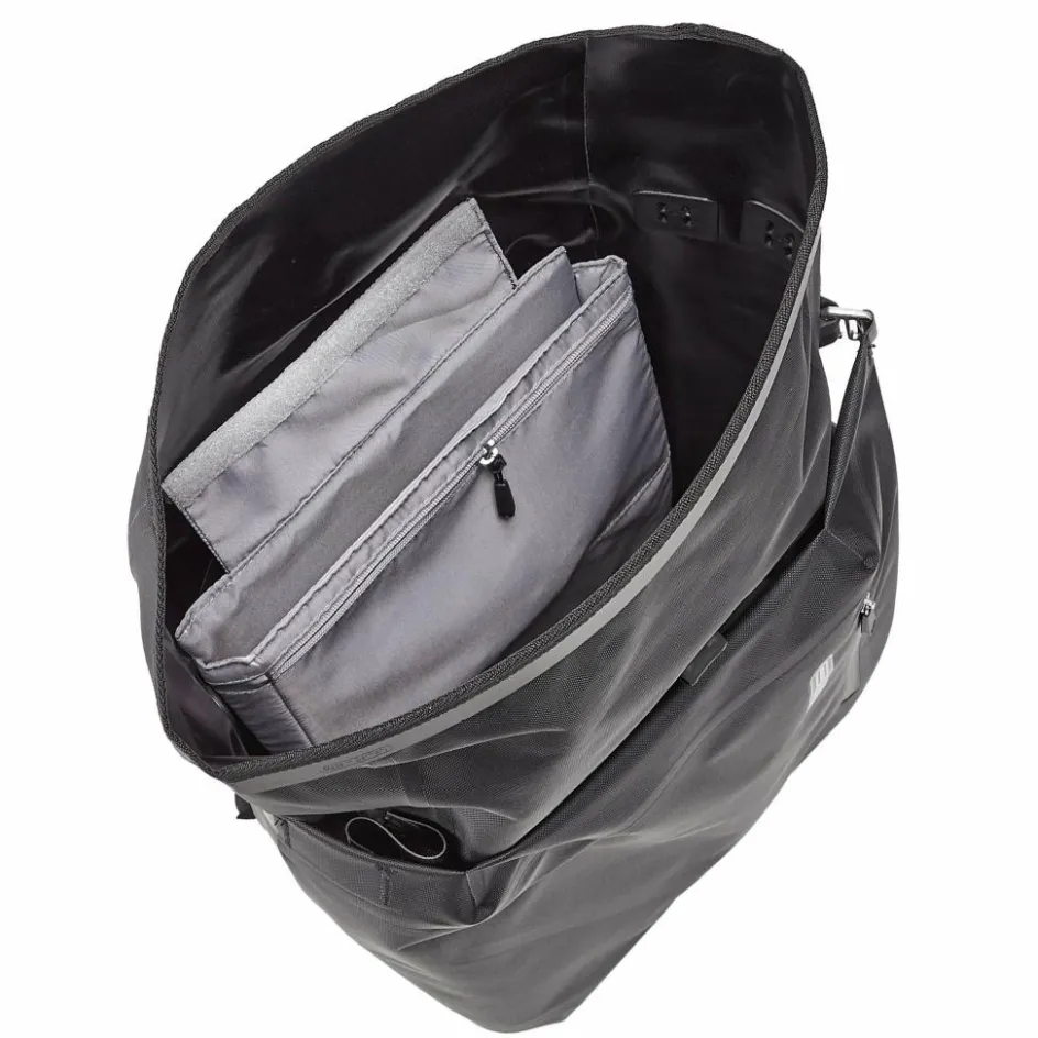 In der Rucksack-Position hat das Flap außerdem noch ein RV-Fach, das du als Rucksack-Vorfach nutzen kannst. An der Seite hat der Rucksack eine Netzaußentasche, im Hauptfach eine Laptop-Innentasche.