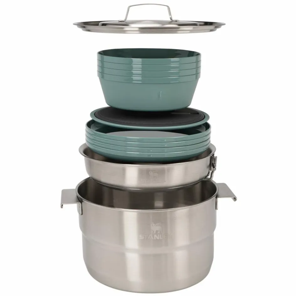 Neben Topf und Pfanne beinhaltet das Set weitere Kochutensilien (Pfannenwender, Kochlöffel und Besteck) und ein rutschfestes Schneidebrett mit abnehmbarem Untersetzer. Das Geschirrset für vier Personen umfasst hohe Teller und stapelbare Schüsseln für ein gemütliches Essen im Freien mit der ganzen Familie.
