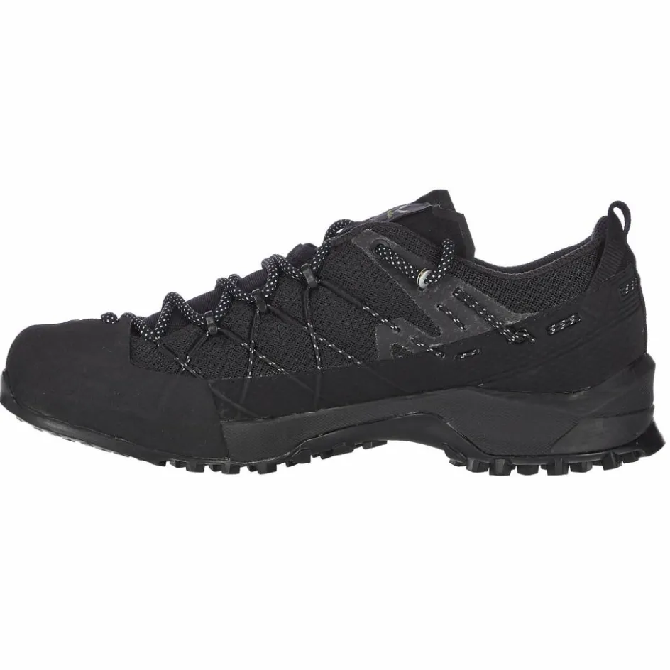 Zuerst gehen wir auf den generellen Aufbau des sehr technischen Zustiegsschuhs ein. Der Halbschuh, der auch für Klettersteige geeignet ist, besteht vollständig aus synthetischen Materialien. Dadurch ist der Schuh trotzdem relativ leicht, das Material ist außerdem flexibel genug, um bei schwierigen Tritten optimal die Bewegung unterstützen zu können. Damit das relativ luftige Material bei Felskontakten keinen Schaden nimmt, wurde es mit Kevlar verstärkt, das auch in ballistischen Westen zum Einsatz kommt.