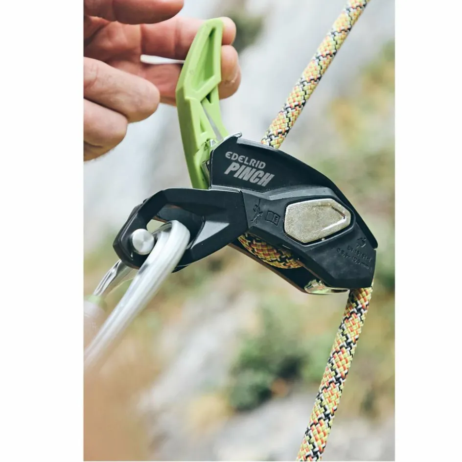 Das Pinch ist ein Sicherungsgerät mit Blockierfunktion. Es kann ohne Karabiner direkt am Gurt befestigt werden. Die körpernahe Positionierung erleichtert die Seilkontrolle beim Sichern.