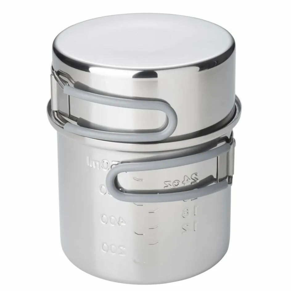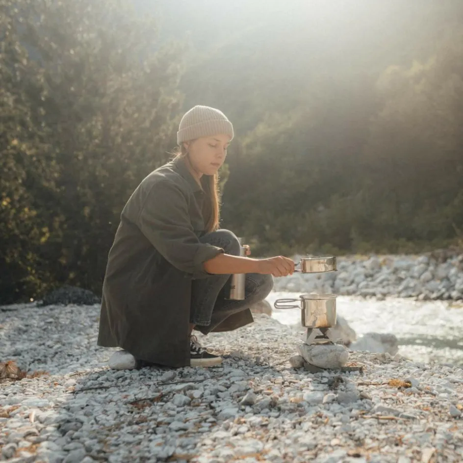 Auf den ersten Blick ein einfacher Topf mit Deckel. Doch im kleinen Set steckt viel mehr. Minimalisten können den Deckel mit max. 475 ml Volumen als Trinkgefäß nehmen, andere als Soßentopf. Im großen Topf ist Platz für ein kleines Gericht. Bis zu 750 ml Wasser kann schnell zum Kochen gebracht werden. Im Topf hat eine 230 g Gaskartusche und ein kleiner Gaskocher Platz. So ist das Kochset kompakt und griffbereit verstaut.