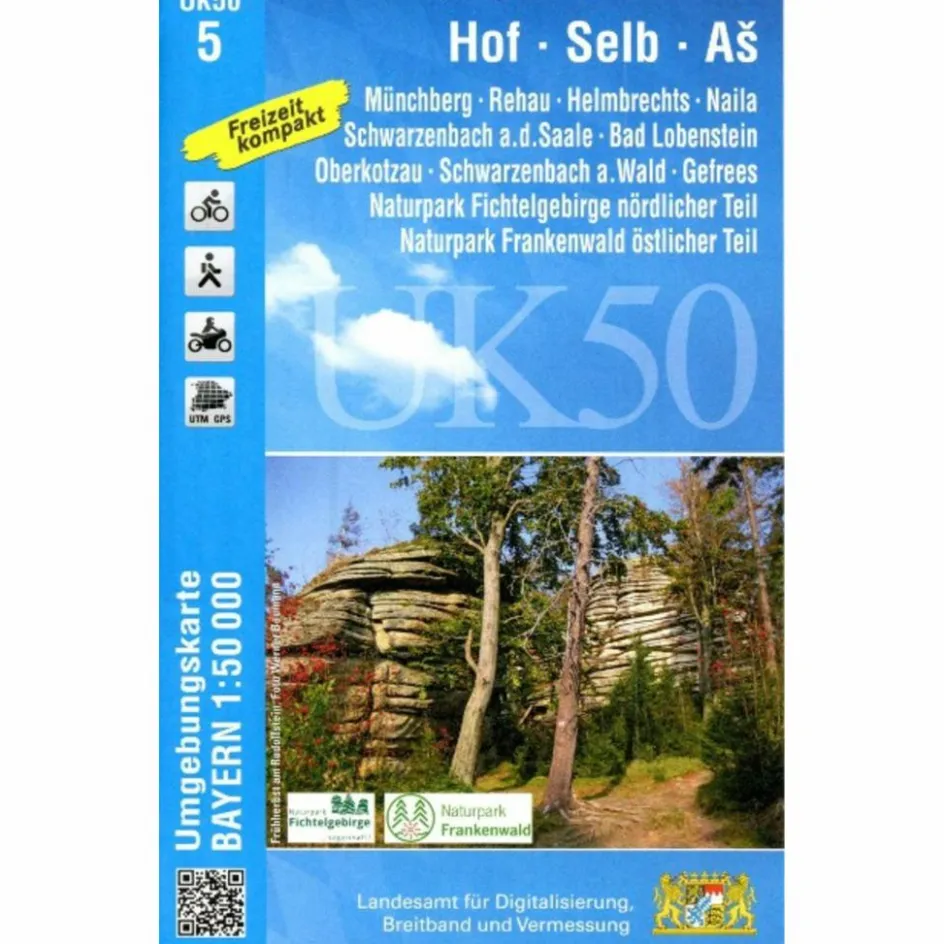Die UK50-5 zeigt Teile von Frankenwald und Naturpark Fichtelgebirge. Im Norden der Karte wird die Grenzregion Vogtland abgebildet. Überregional bekannt ist die an der Saale gelegene Stadt Hof und die Porzellan-Metropole Selb.Fernradfahrer führt der beliebte Saaleradweg „Durch Bayerns steinreiche Ecke“ zu den Städten Münchberg, Gefrees und Oberkotzau. Einwandfrei ausgeschildert geht’s vorbei an faszinierenden Felsformationen und zahlreichen geologischen Besonderheiten. MTB-Fans finden rund um Schwarzenbach am Wald und im gesamten Fichtelgebirge ein reiches Betätigungsfeld. Weitwanderer müssen auf jeden Fall nach Blankenstein in Thüringen: Dieses „Drehkreuz des Wanderns“ ist Anfangs- (oder End-) Punkt von Rennsteig, Kammweg, Frankenweg und Fränkischem Gebirgssteig!