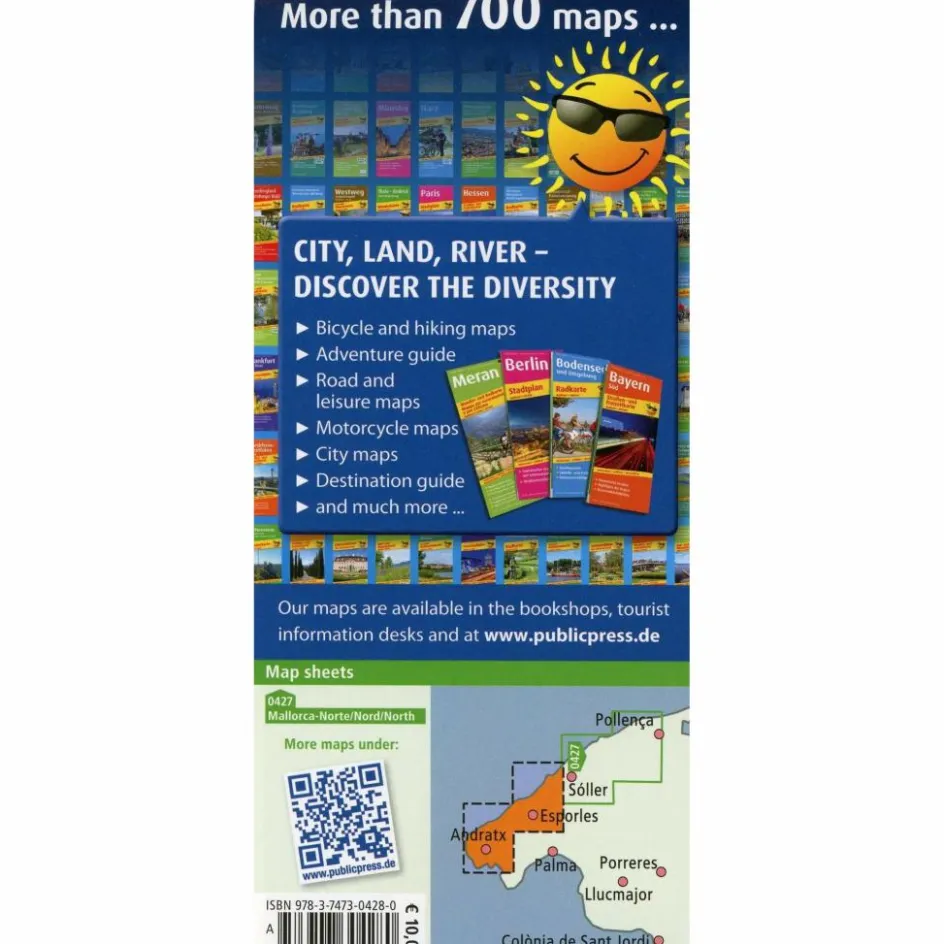 Die viersprachige Karte (deutsch, englisch, französisch, spanisch) hat den südlichen Teil des Tramuntana-Gebirges zwischen Deià und Paguera auf der beliebten Baleareninsel zum Ziel. Durch malerische, schattige Waldgebiete, entlang der Trockenmauerlandschaft mit ihren historischen Ruinen bieten sich immer wieder neue, teils grandiose Aussichten, während pittoreske Dörfer wie Deià und Valledemossa zu Besichtigungen einladen. Die Wanderungen verlaufen zumeist auf öffentlichen Wegen. Markiert sind die Routen mit Steinmännchen und Farbmarkierungen, die manchmal etwas mehr Aufmerksamkeit erfordern.