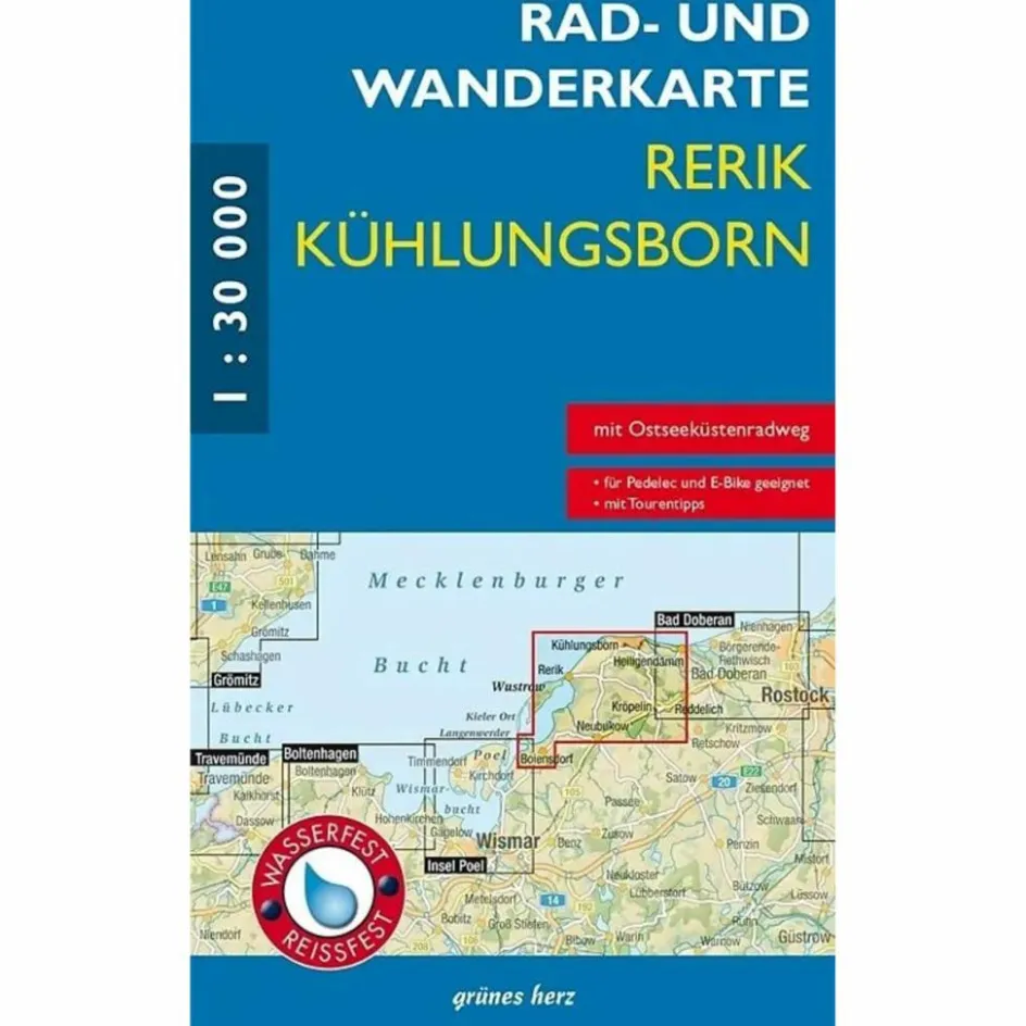 Mittelpunkt dieser Rad- und Wanderkarte bilden die beiden Ostseebäder Rerik und Kühlungsborn. Der Kartenausschnitt reicht von Kühlunsgborn im Norden bis nach Neubukow im Süden sowie von der Halbinsel Wustrow im Westen bis nach Vorder Bollhagen im Osten. Weitere sehenswerte Orte im Kartenbereich sind Kröpelin und das Seeheilbad Heiligendamm. Die topographische Karte im Maßstab 1:30.000 enthält die exakte Wegezeichnung der durch die Region führenden Fernradwege – mit Angaben zur Oberflächenbeschaffenheit – sowie Verlauf und Markierung der Wanderwege. Eine spezielle Symbolik innerhalb der topographischen Karte widerspiegelt die touristischen Besonderheiten und Leistungsangebote. Die Kartenrückseite gibt kurze Erläuterungen zu besuchenswerten Orten und Plätzen, die durch Fotos ergänzt werden. Die Karte zeichnet sich durch ihre wasser- und reißfeste Beschaffenheit und ein handliches Format (48 x 60cm) aus.