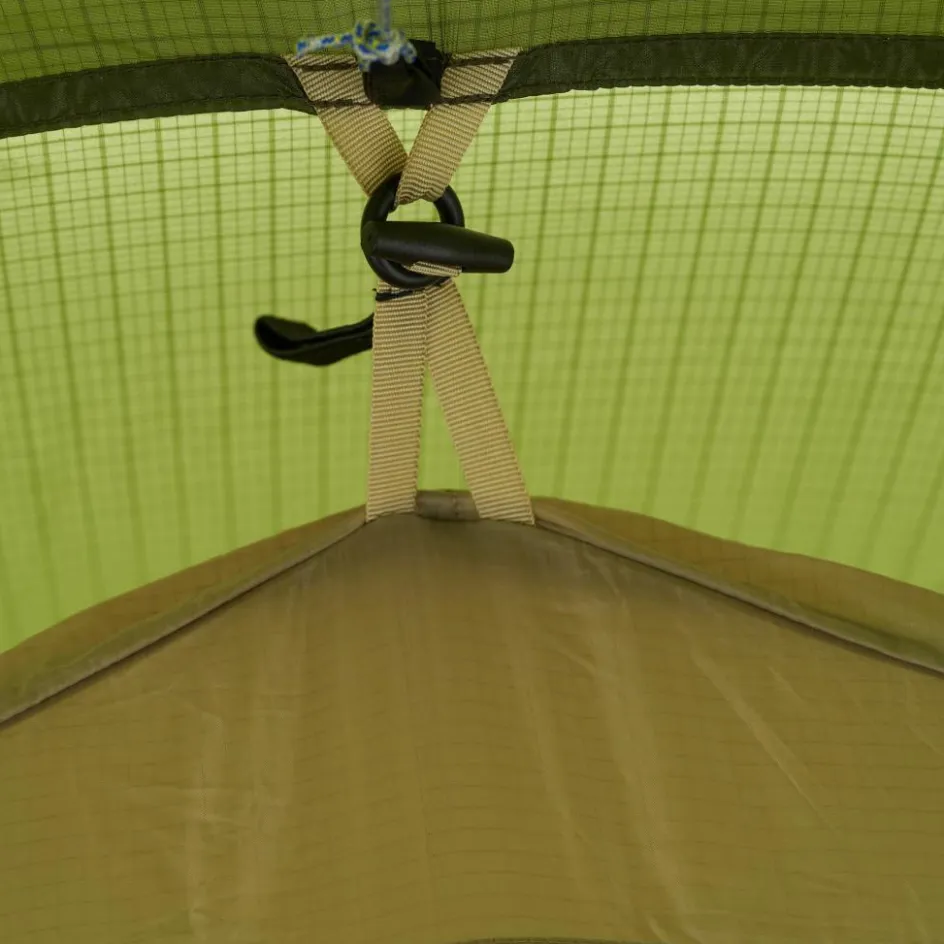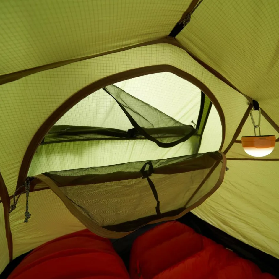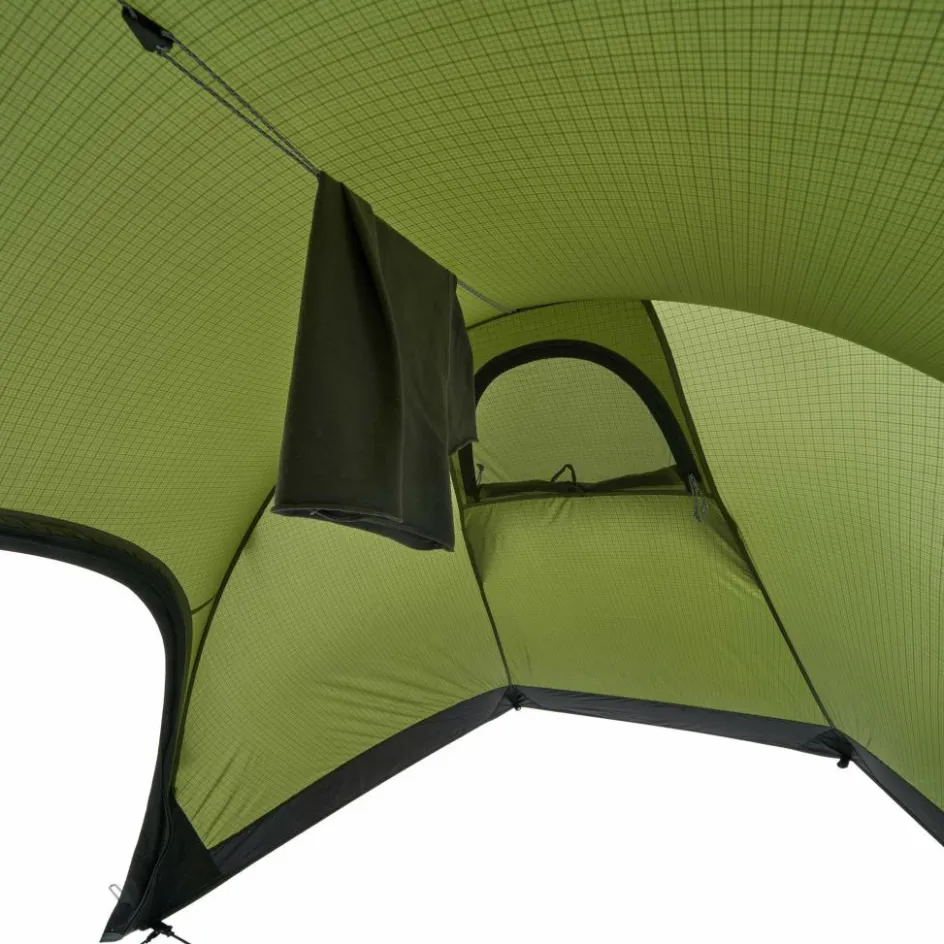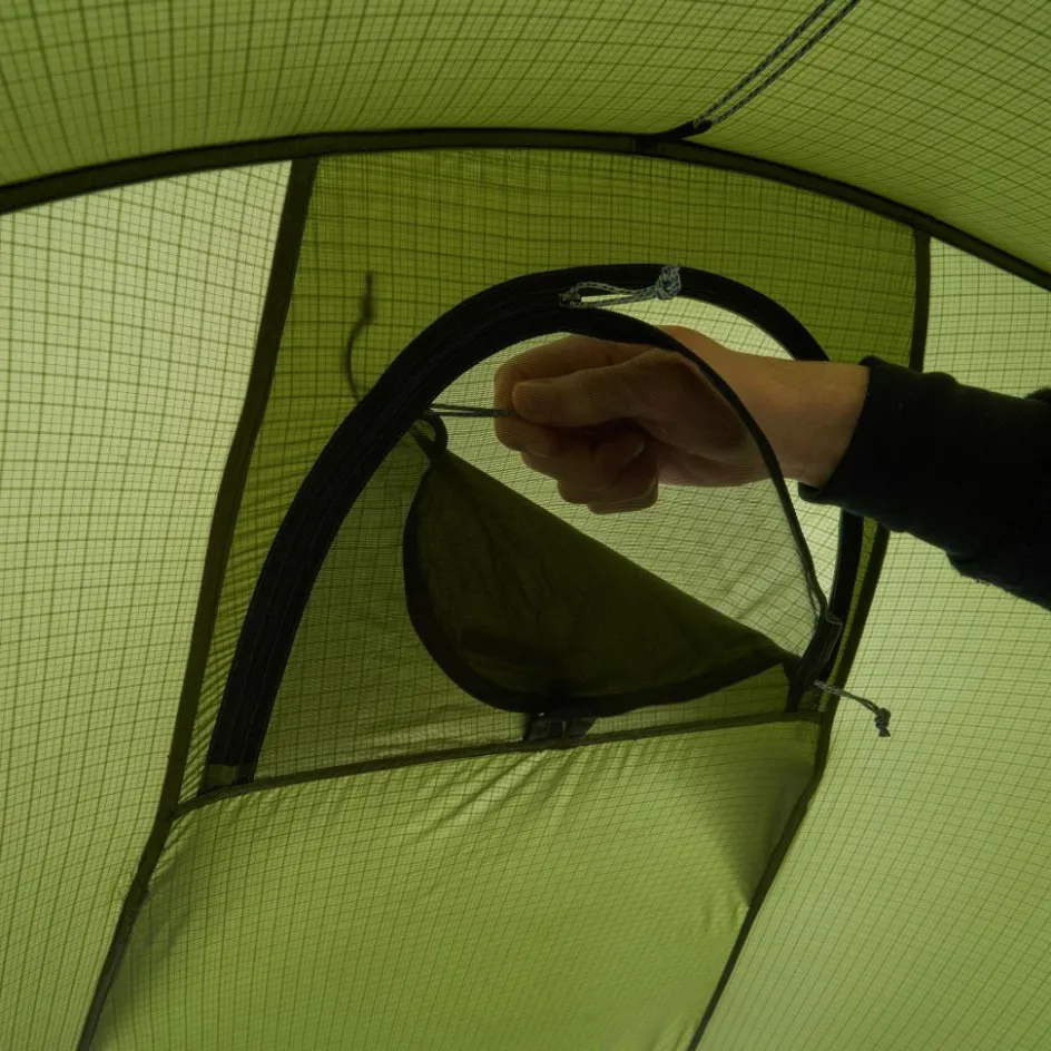 Die Apsis ist großzügig bemessen und nimmt deinen Rucksack und weitere Ausrüstung auf. Sowohl die Apsis als auch das Innenzelt sind mit einer Wäscheleine ausgestattet, auf der du feuchte Kleidung zum Trocknen aufhängen kannst. Kleinteile finden hingegen in den Mesh-Seitentaschen einen zugriffsbereiten Platz.