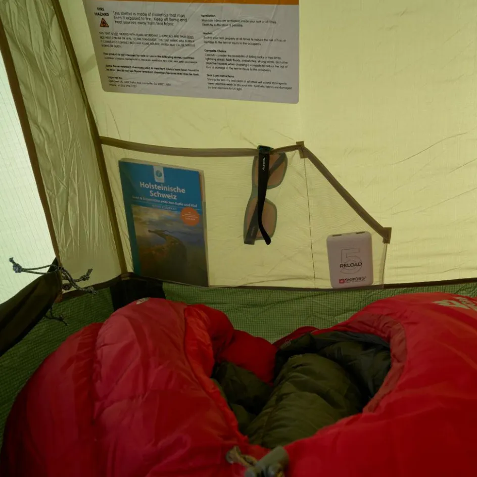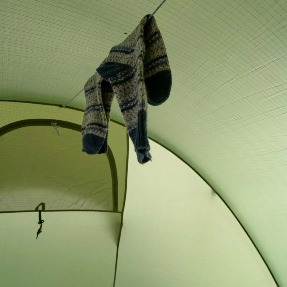 Auch die Details überzeugen. In der großen Apsis sowie im Innenzelt befindet sich eine Wäscheleine, auf der du feuchte Ausrüstungsgegenstände über Nacht trocknen kannst. Für Ordnung im Innenzelt sorgen mehrere Netztaschen.