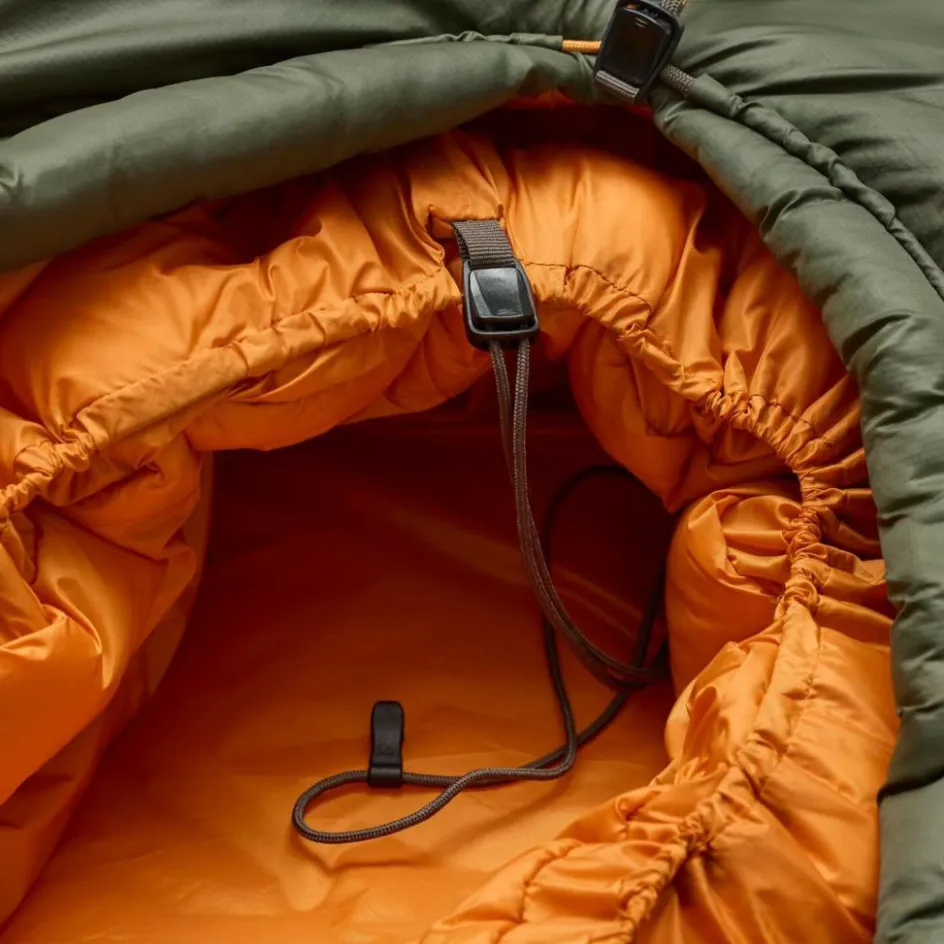 Die ergonomisch geschnittene Kapuze kann weit zugezogen werden, während ein Wärmekragen die aufgewärmte Luft im Schlafsack hält. Um auch in der Dunkelheit den richtigen Schnürzug zu finden, sind die Stirn- und Halspartie mit Rund- und Flachkordeln ausgestattet.