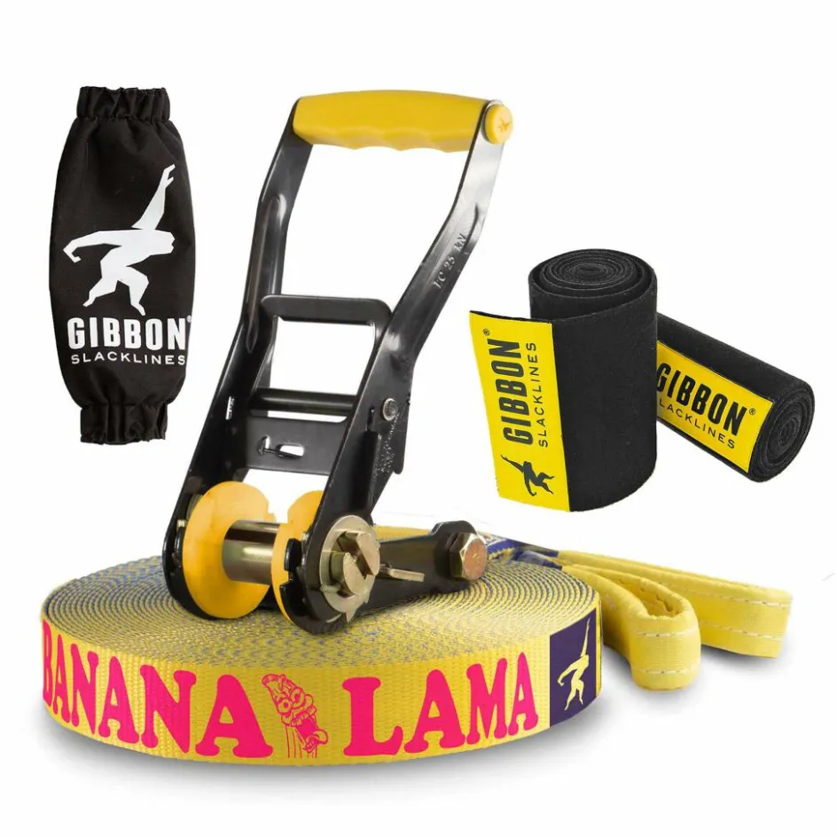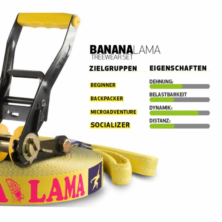 Lieferumfang: 12,5 m BananaLama Slackline, 2,5 m Ratschenband, Ratsche mit Rücksicherung und Spacer, 2 Baumschoner.